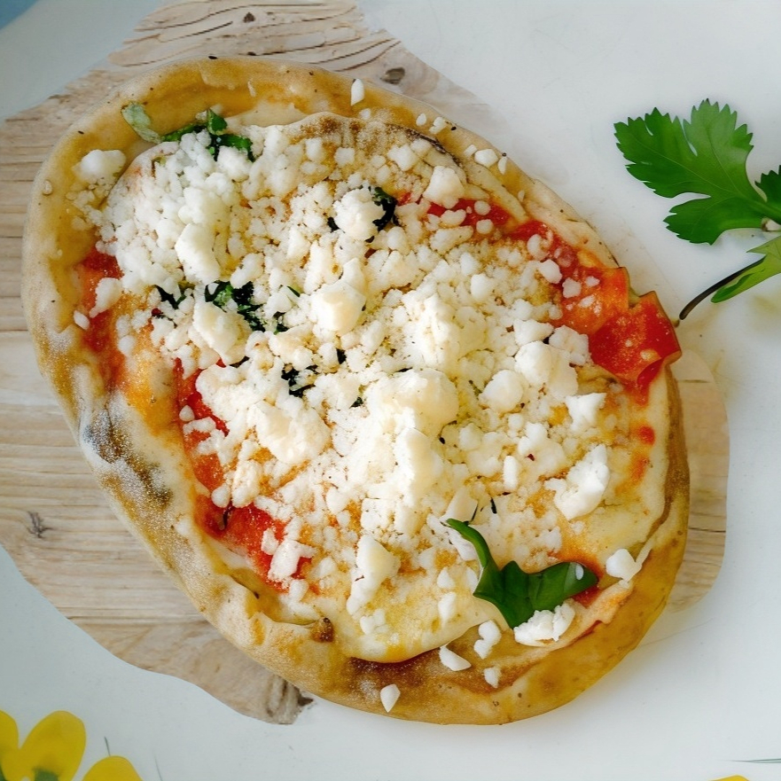 Sope de queso rallado y Oaxaca con frijoles refritos, salsas de la casa, cebolla y cilantro.