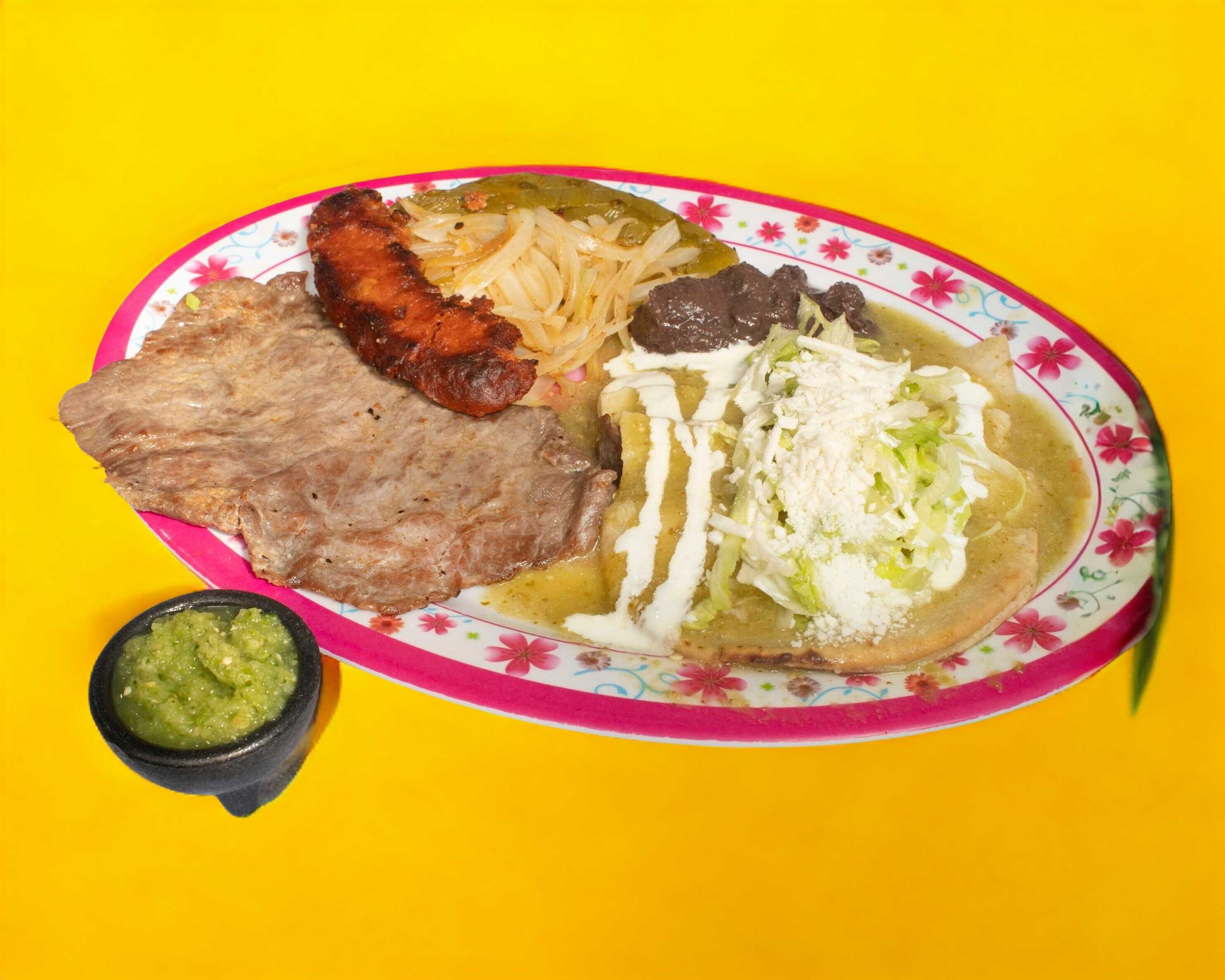 Chorizo, nopal con cebollitas, cuatro enchiladas verdes con lechuga, crema y queso, fijoles refritos.