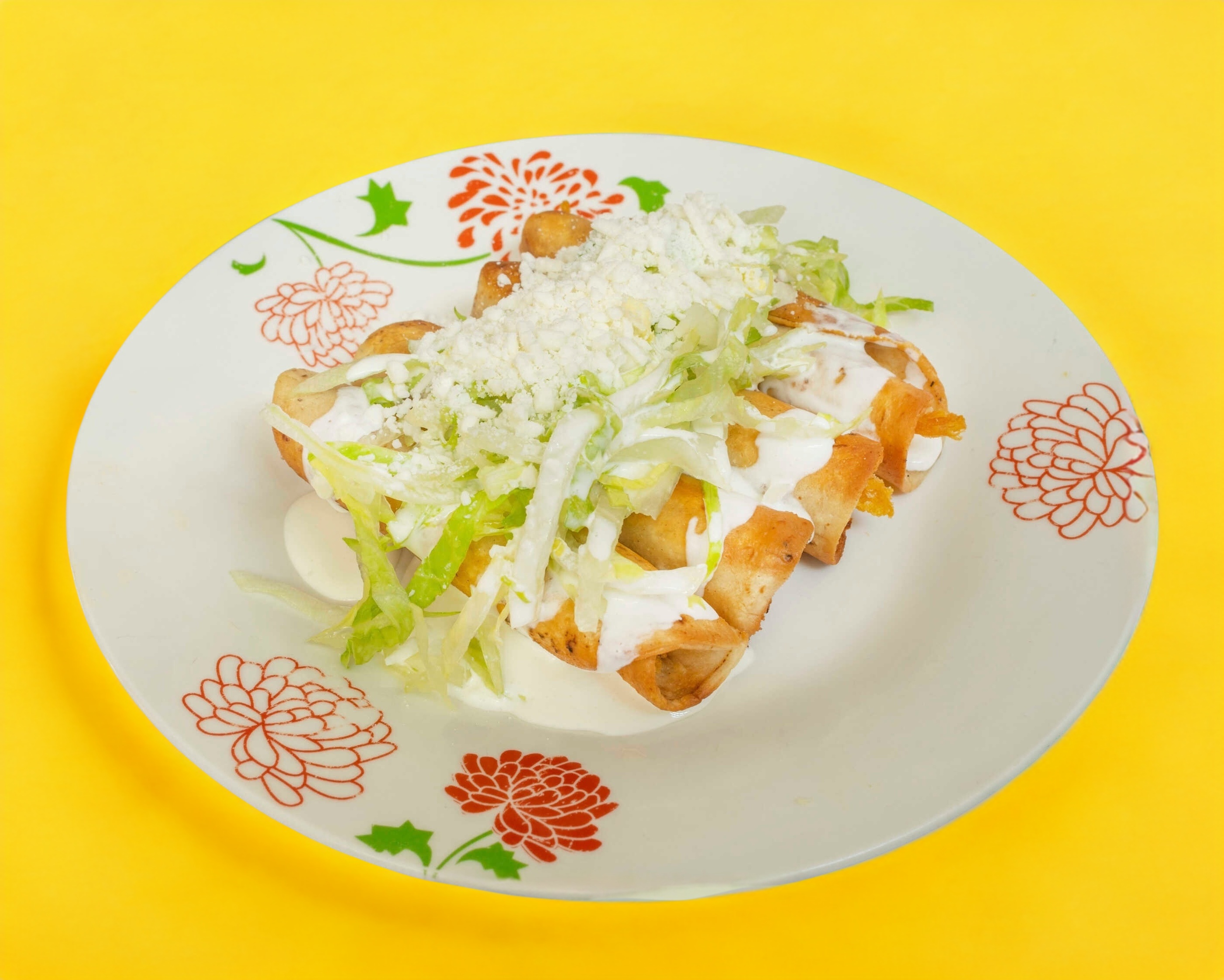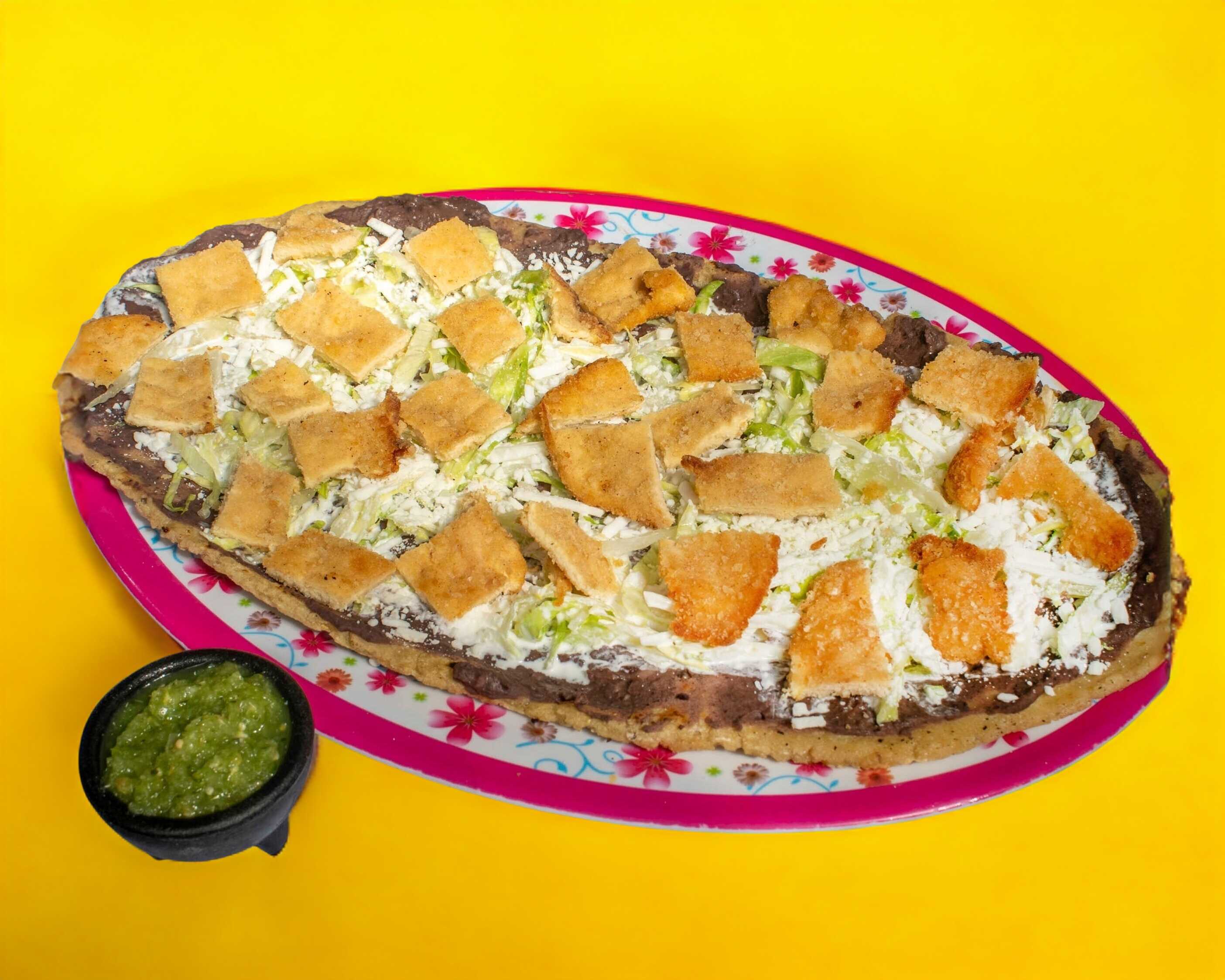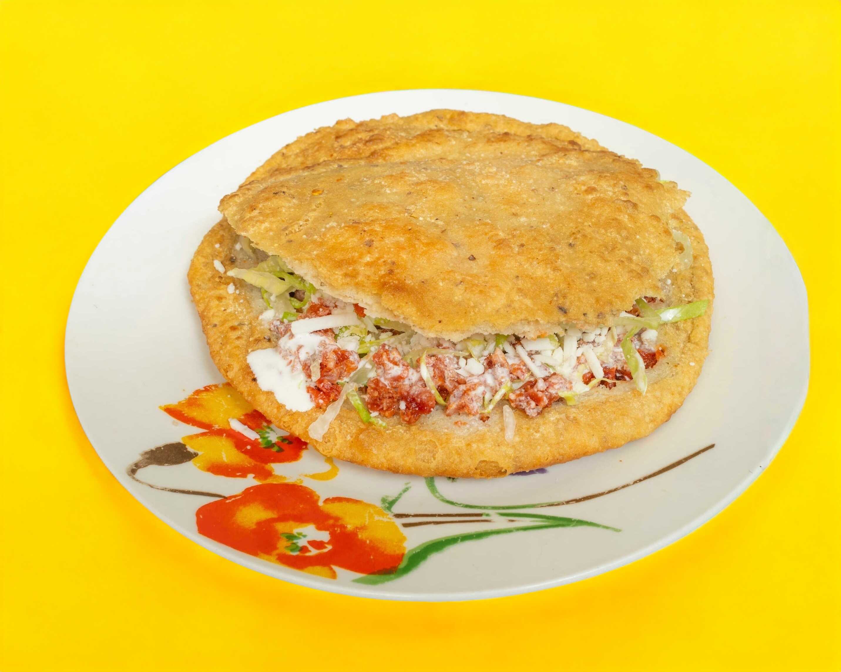 Con lechuga, crema y queso, cinco piezas, rellenas de pollo deshebrado y queso fundido.