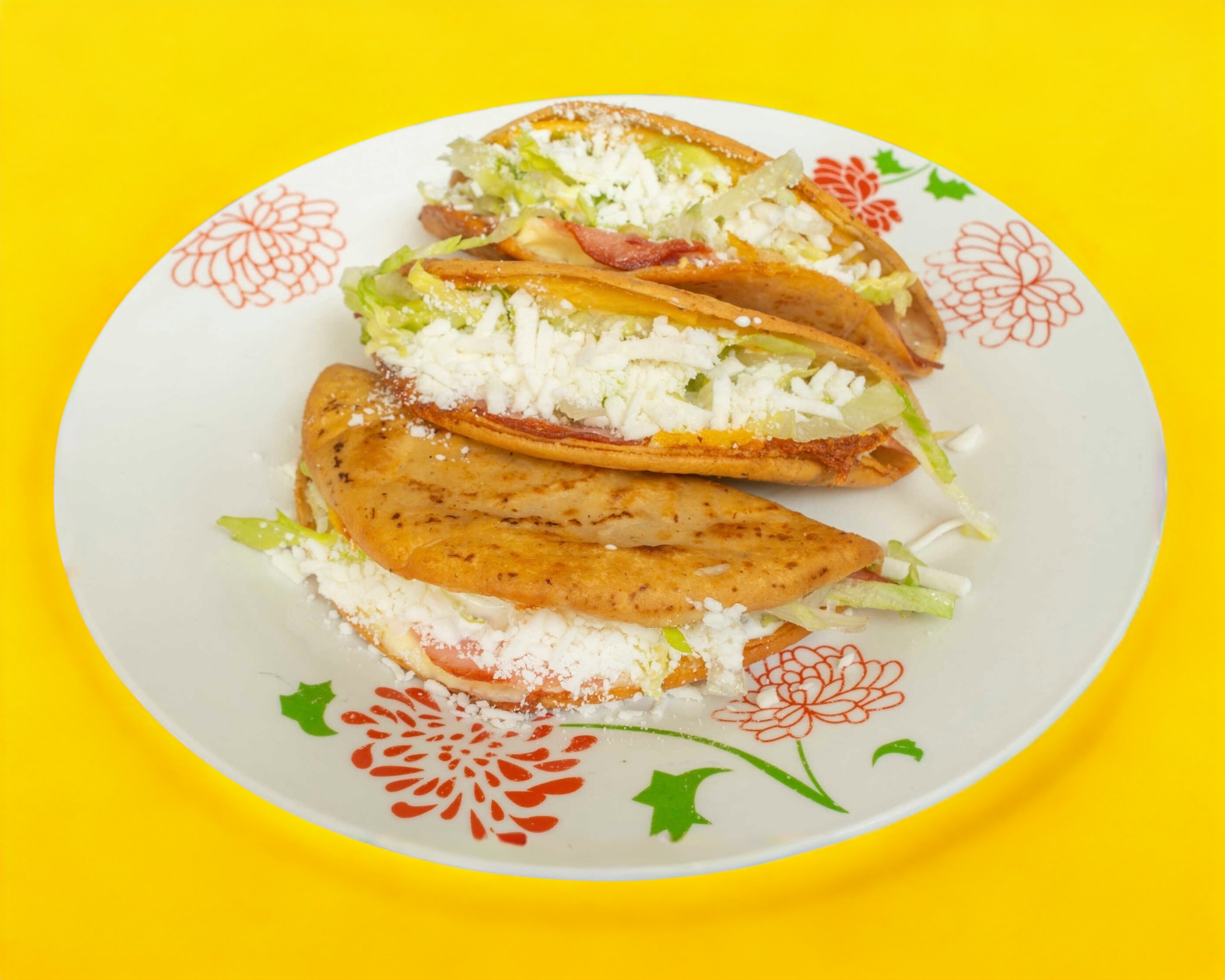 Tres quesadillas rellenas de jamón queso oaxaca y queso amarillo lechuga, crema y queso.