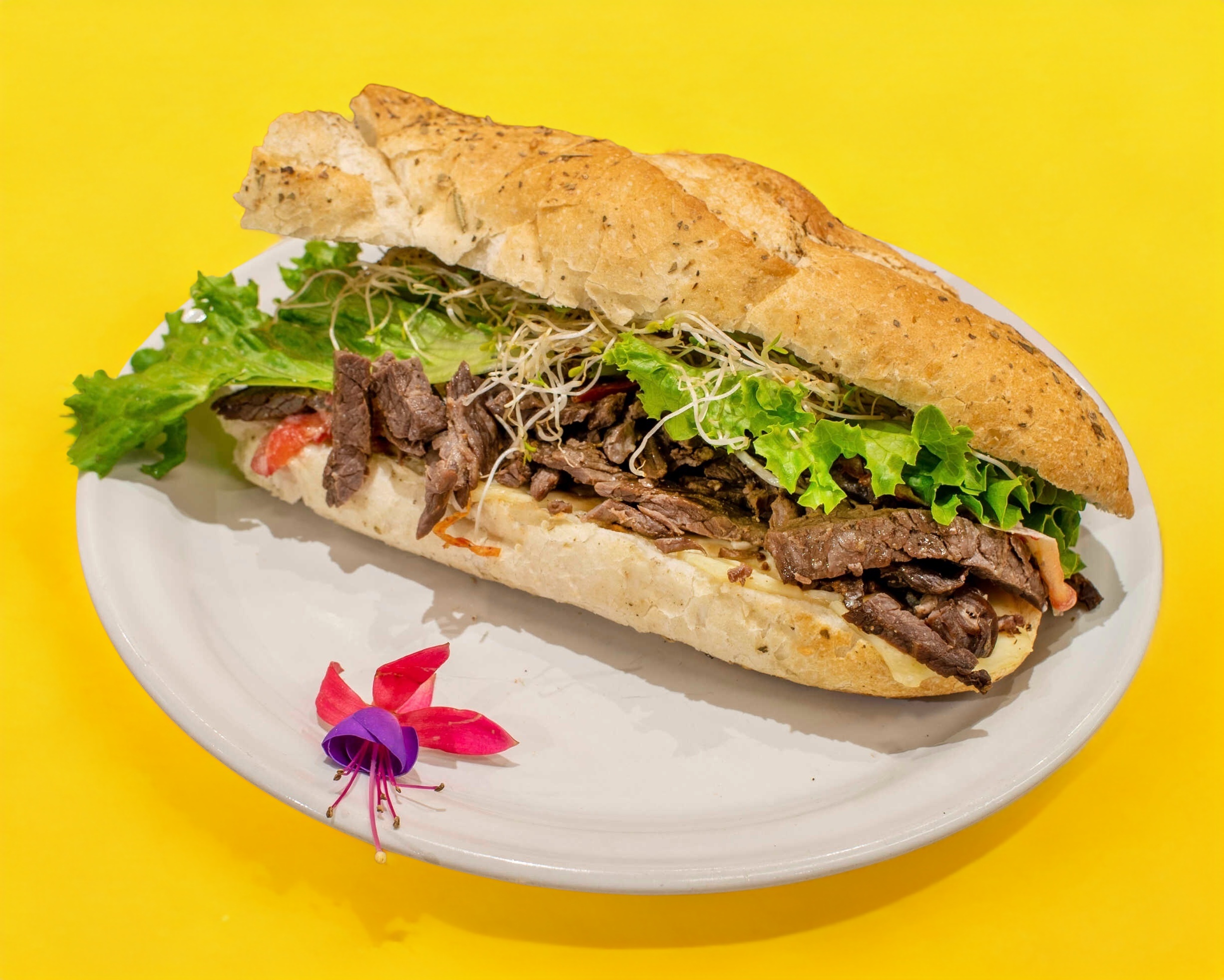 Rico pan tostado, con frijoles, aderezo, aguacate, jitomate, cebolla, queso, germinado, lechuga, pepino.