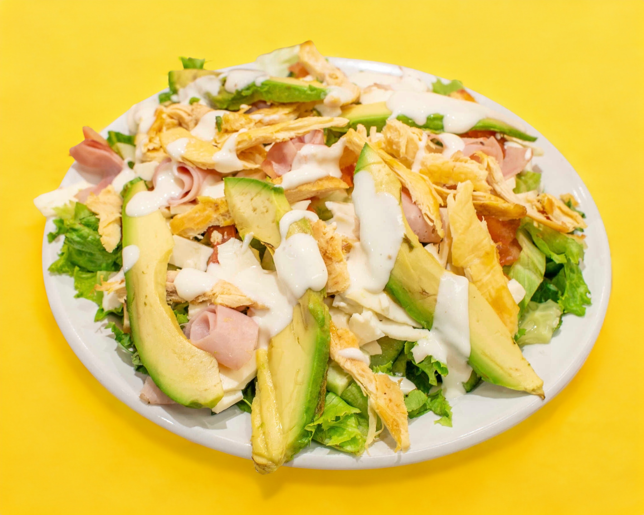 Platillo Personal – Ensalada fresca con 350 g de mix de lechuga y espinaca, aguacate, jitomate, pepino, pechuga de pollo asada, queso panela, aderezos a elegir y un toque de ajonjolí.