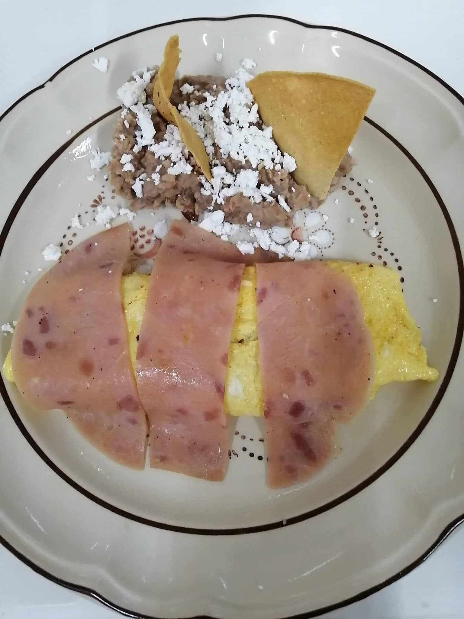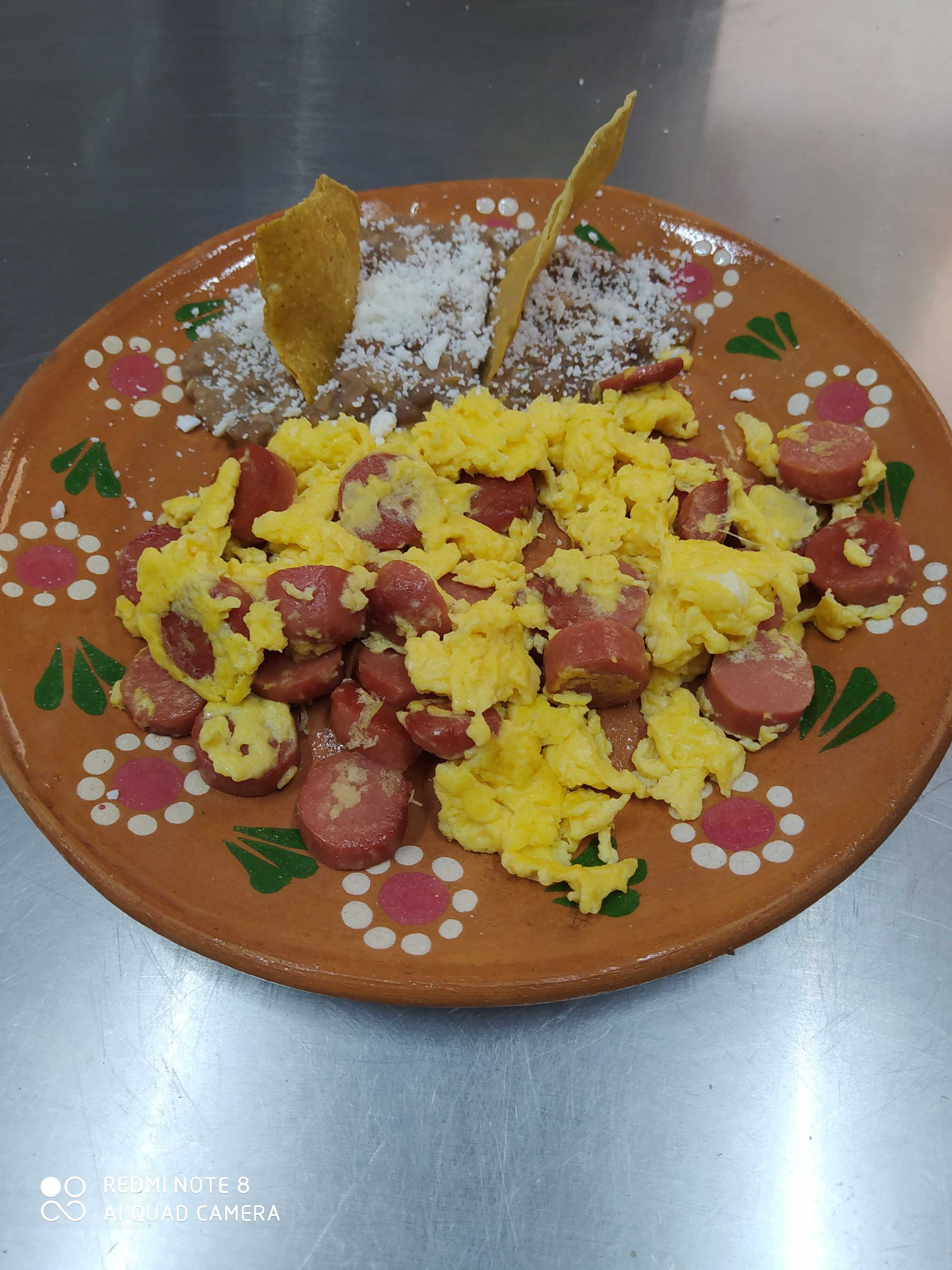 Dos piezas de huevo revuelto con frijoles chismes toreados
