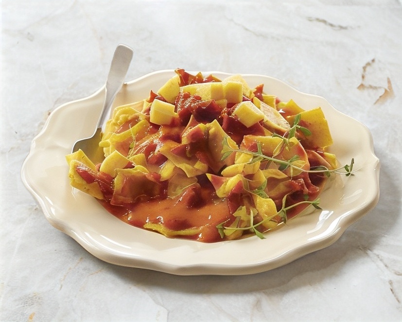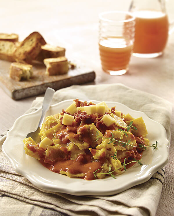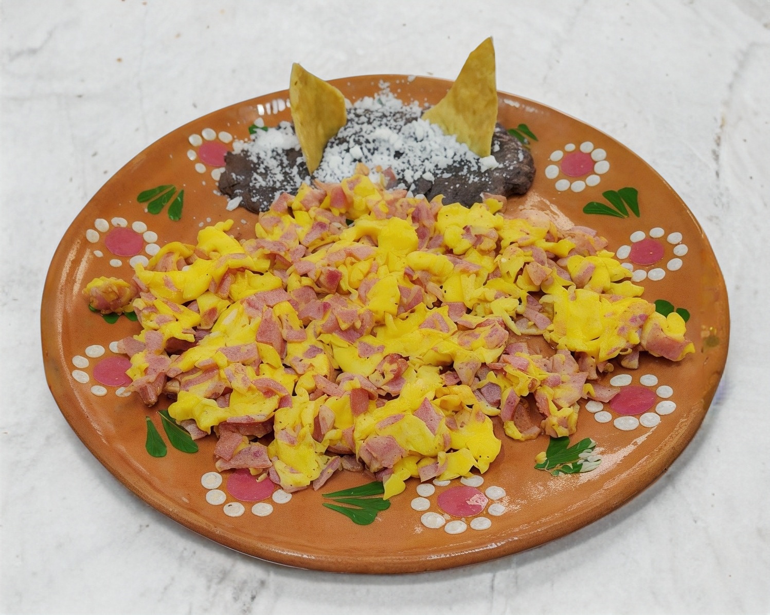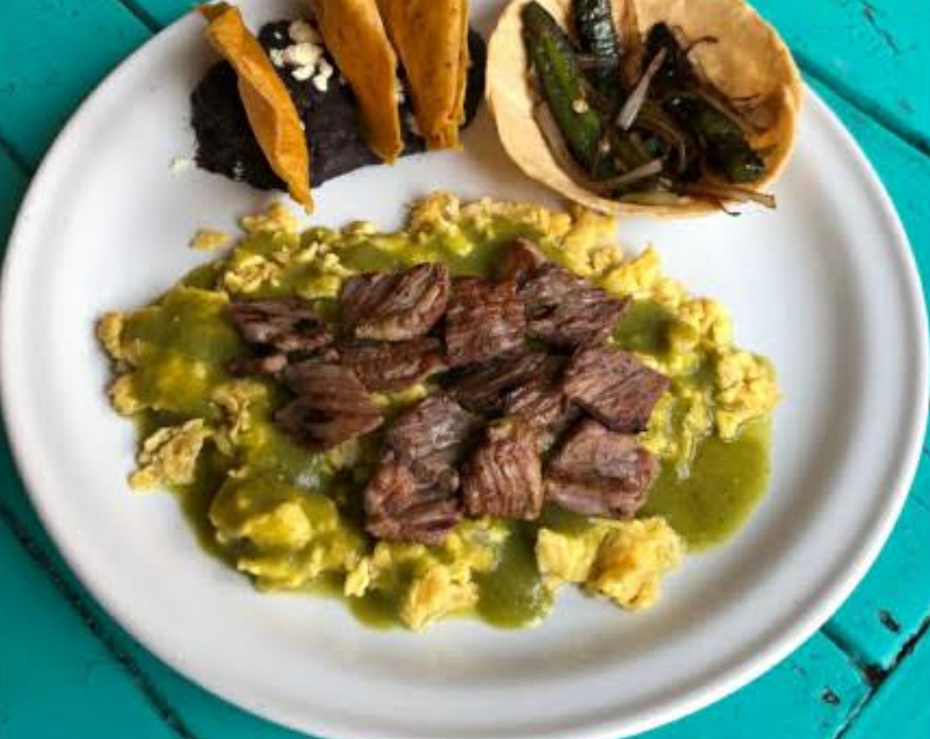 huevos revueltos bañados con salsa de árbol con ojuelas de arrachera.