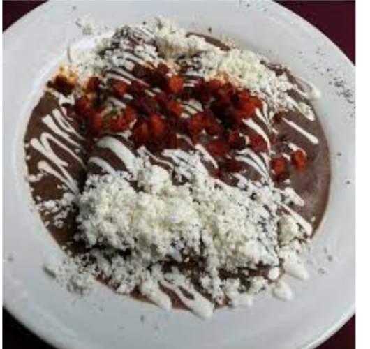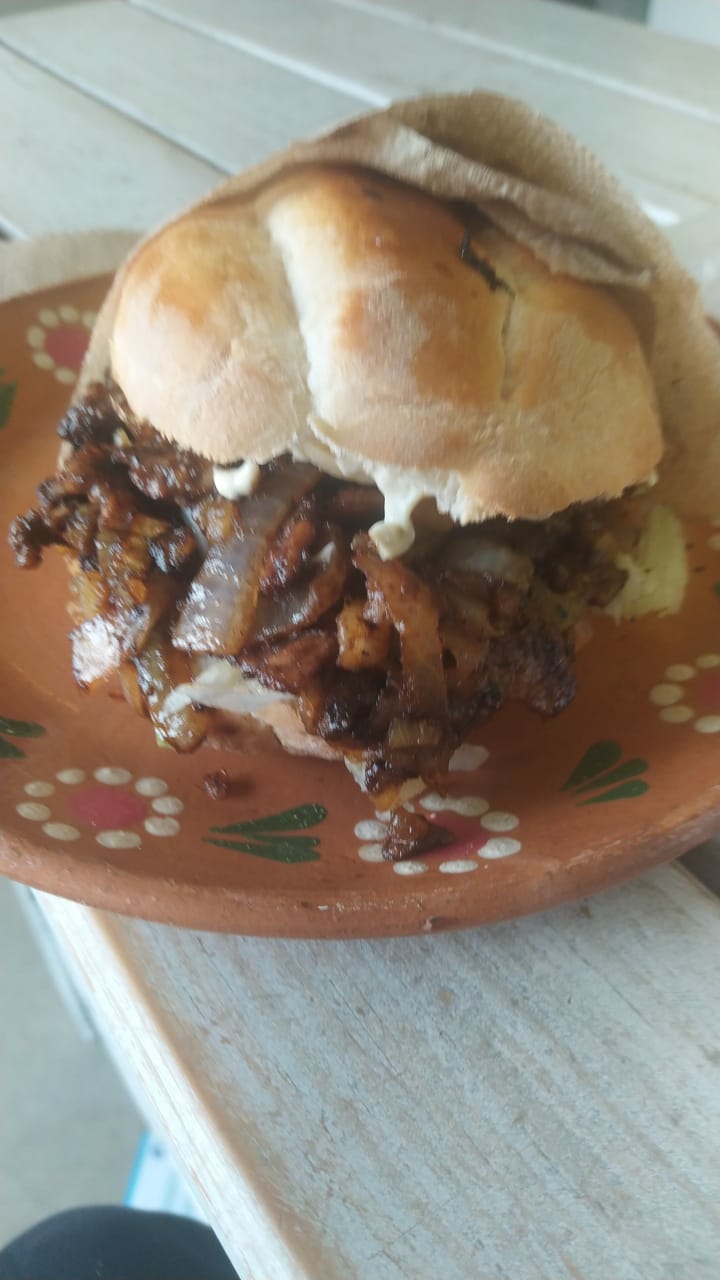 Telera con frijoles, dos enchiladas, cebolla, queso rallado, quesillo y una proteína a elegir.