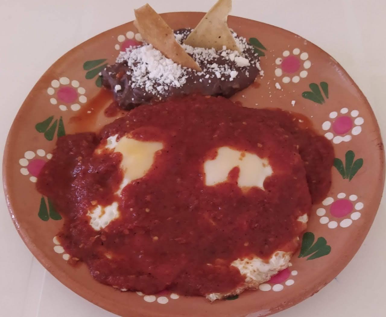 Sobre tortilla, bañados de salsa ranchera y frijoles