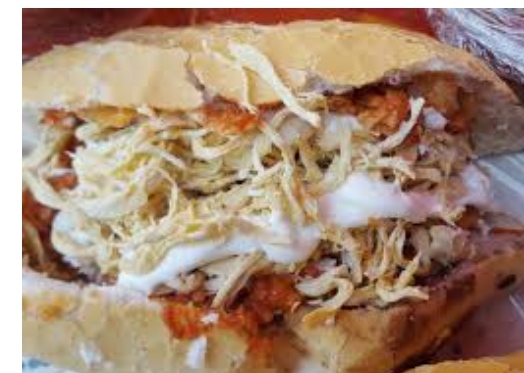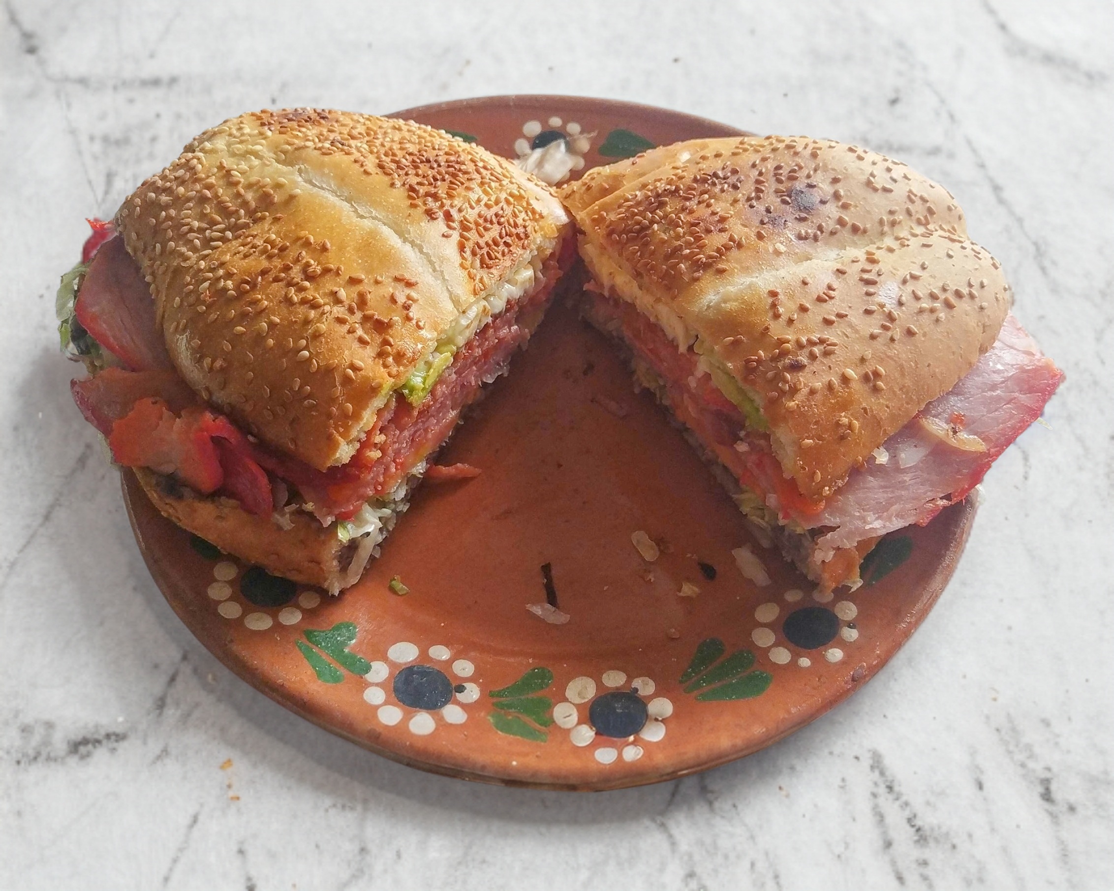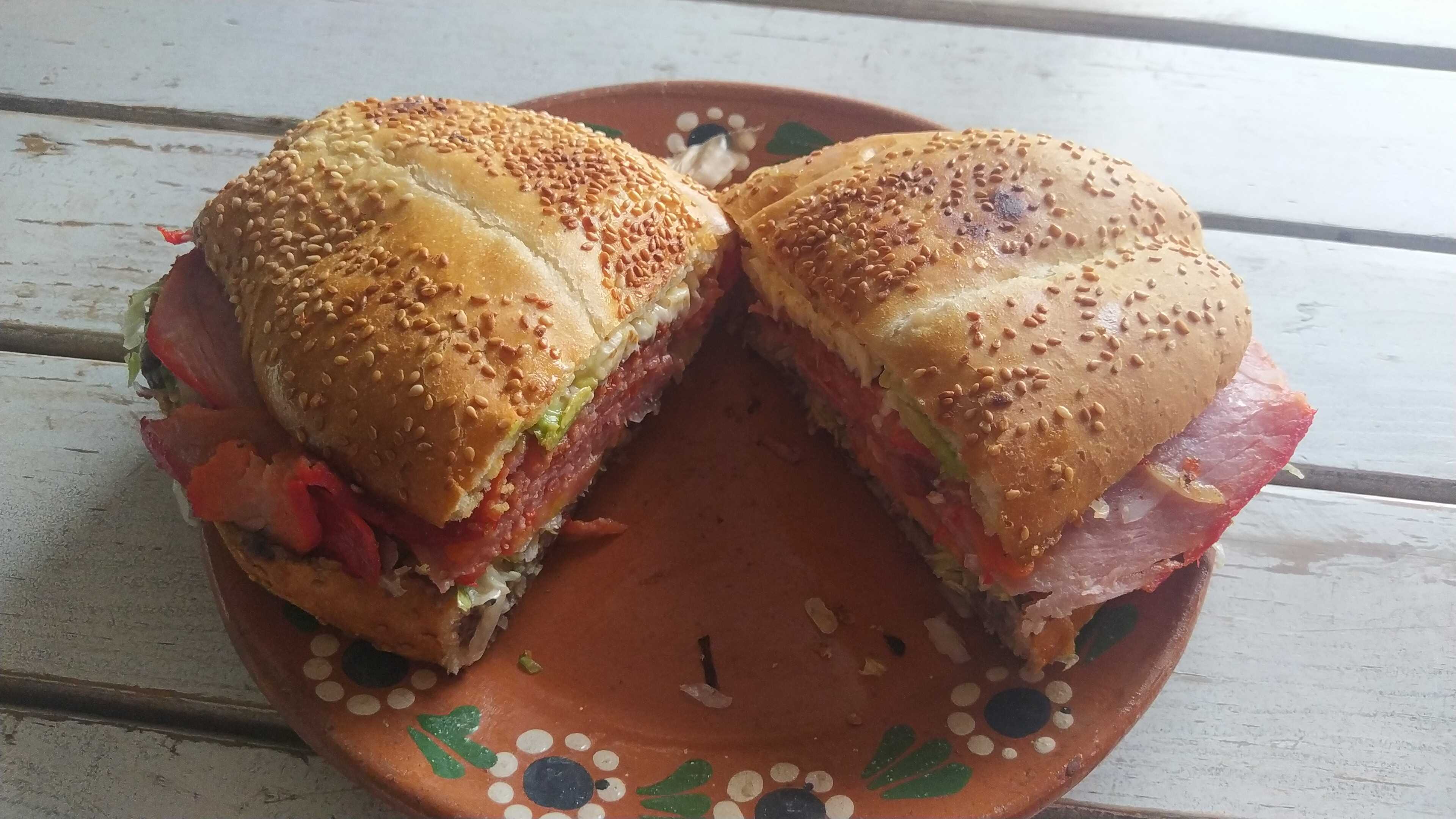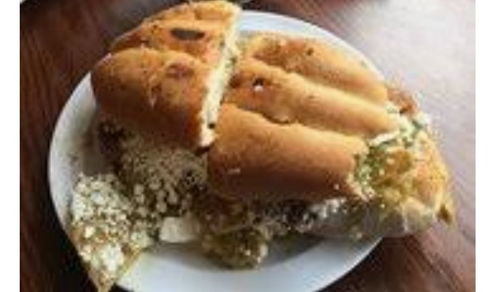 Telera gigante con tres ingredientes, con frijol, lechuga, jitomate, chile, cebolla .