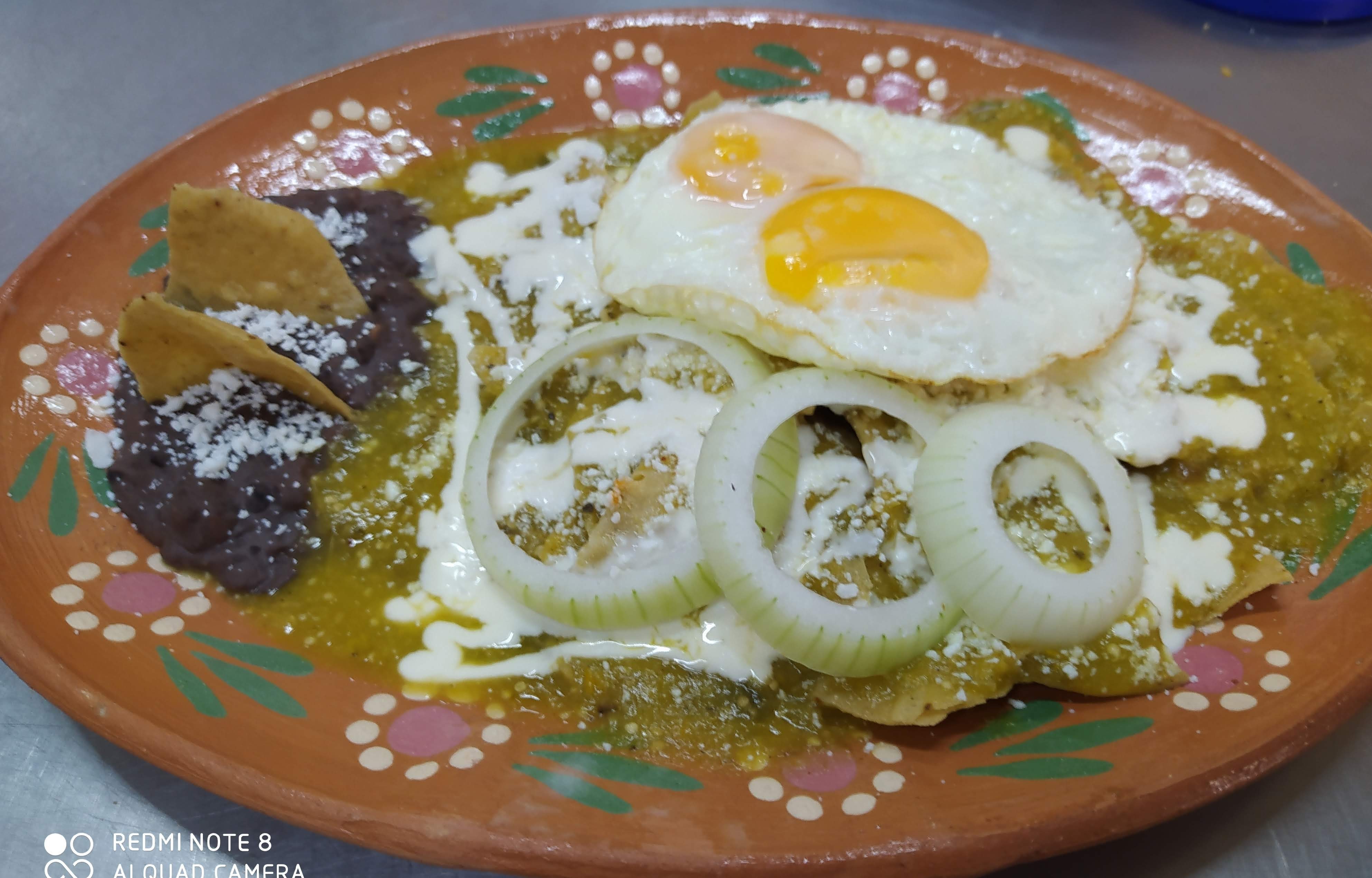 huevos revueltos con tortilla frita, quesillo y salsa norteña.