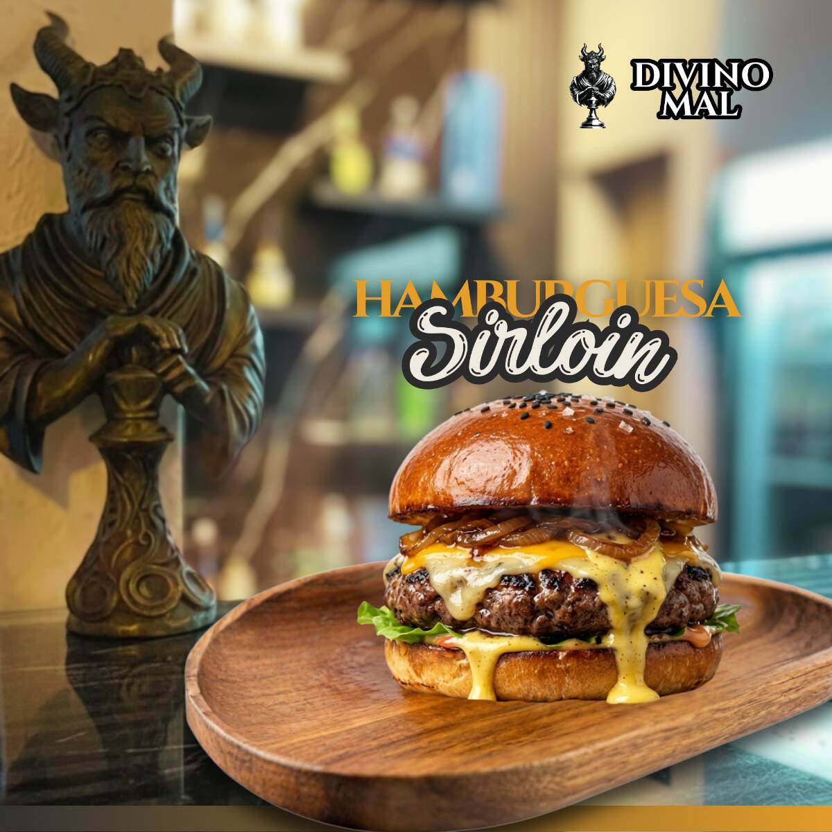 Pan brioche, suave carne sirloin, queso oaxaca, queso americano, catsup, mayonesa, mostaza, cebolla, pepinillos