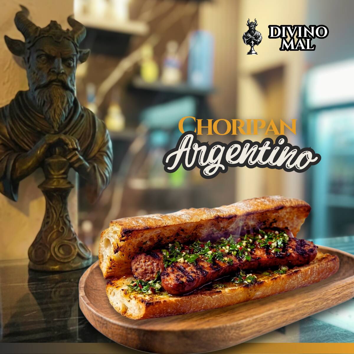 Pan de tipo baguette artesanal crujiente, abierto y tostado a la plancha, relleno con un chorizo argentino premium asado al carbón (mariposa), servido con una generosa capa de auténtico aderezo chimichurri de la casa (perejil, ajo, aceite y especias)