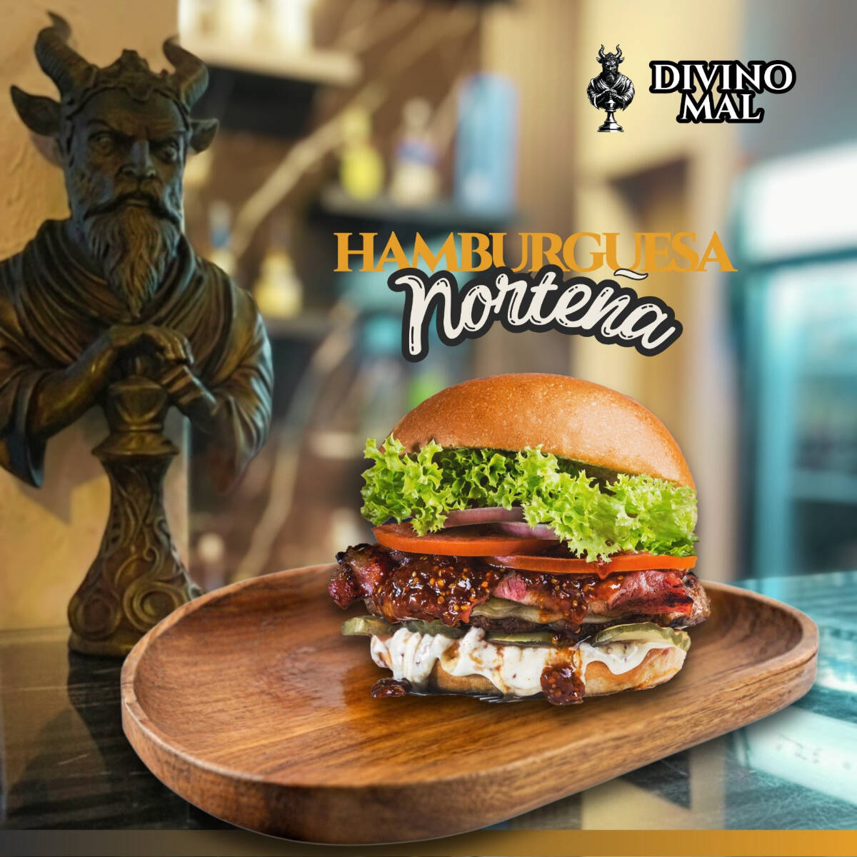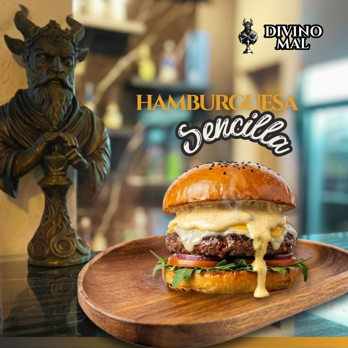 Pan brioche, Doble jugosa carne de res, queso oaxaca, queso americano, catsup, mayonesa, mostaza, cebolla, pepinillos