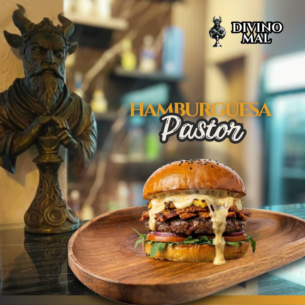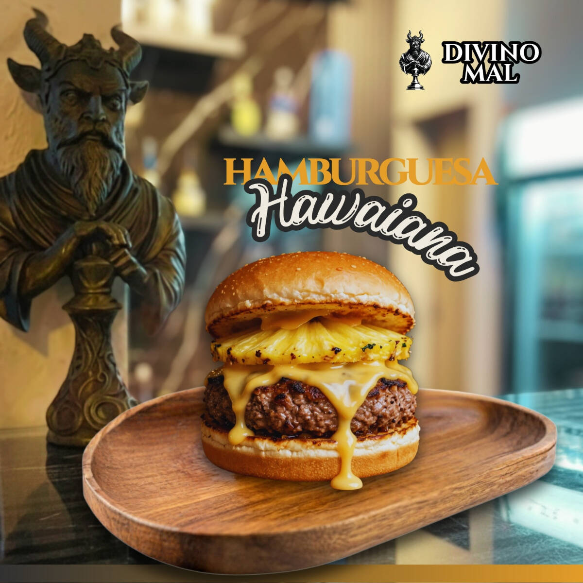Pan brioche, jugosa carne de la casa, piña asada, queso Oaxaca, jamón, queso americano, catsup, mayonesa, mostaza, cebolla, pepinillos