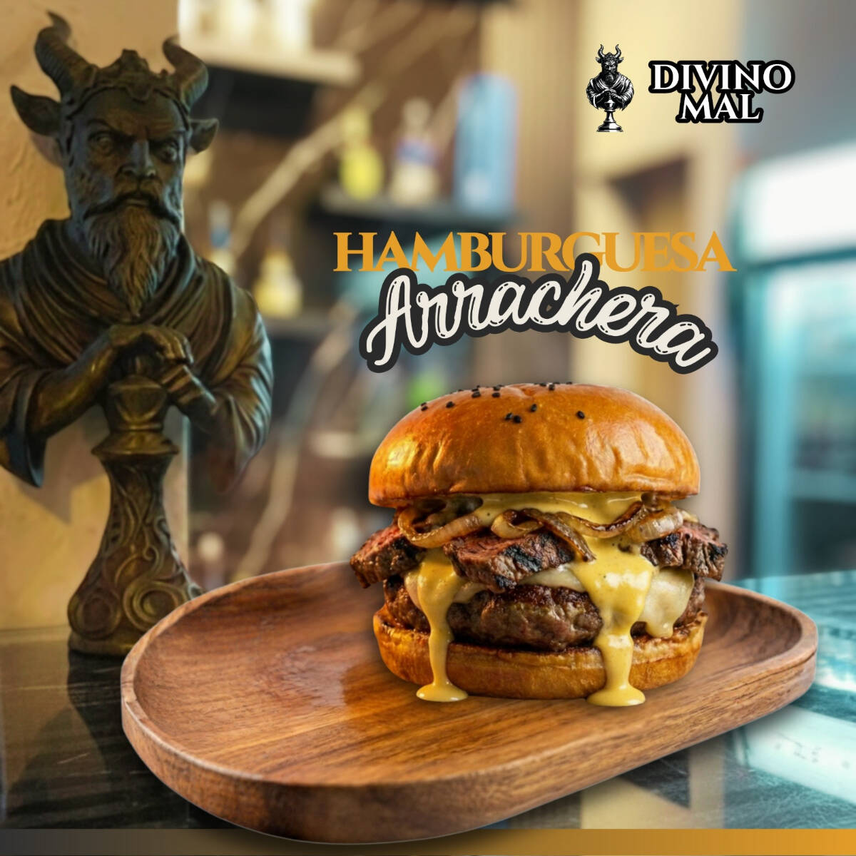 Pan brioche, jugosa arrachera, queso oaxaca, queso americano, catsup, mayonesa, mostaza, chimichurri, cebolla, pepinillos