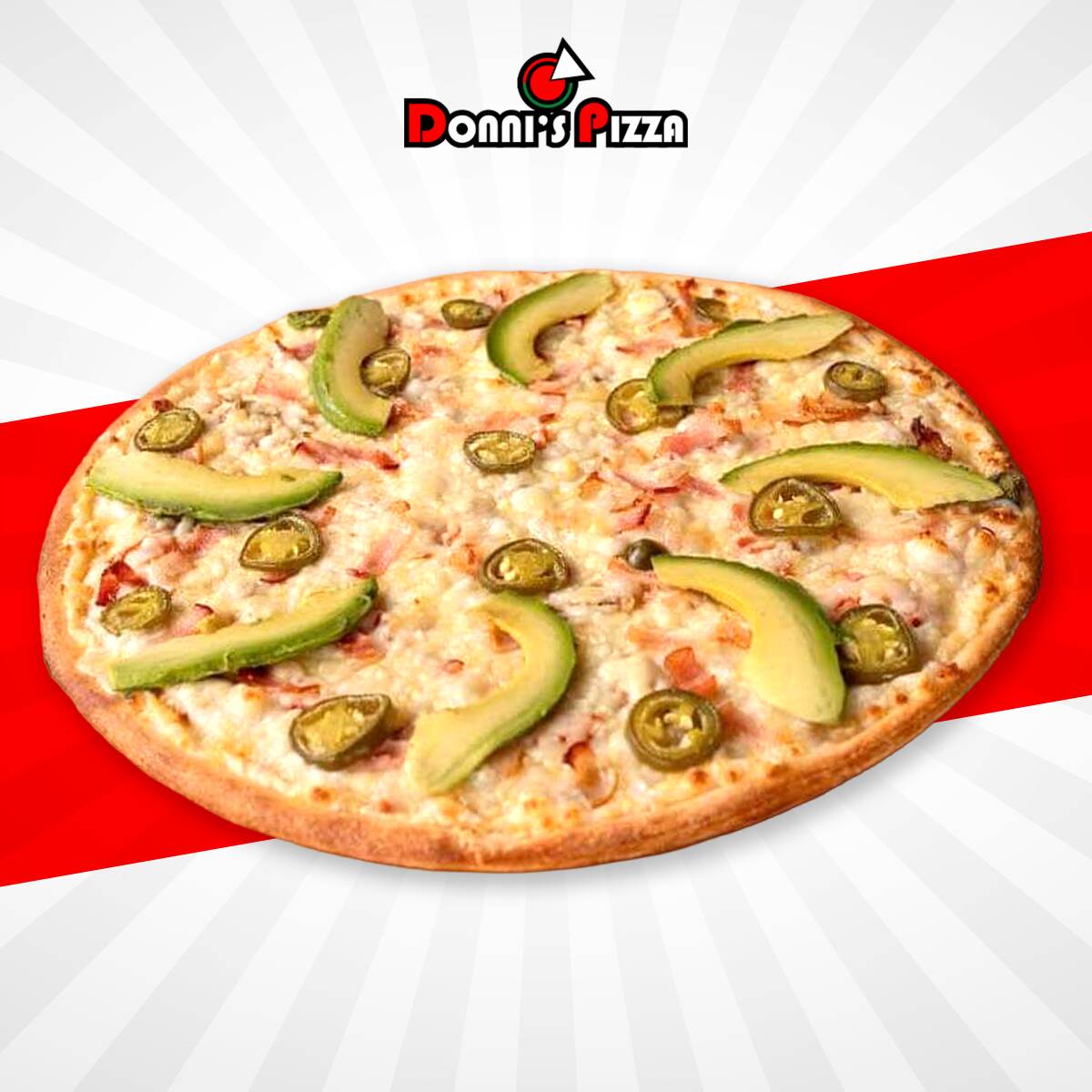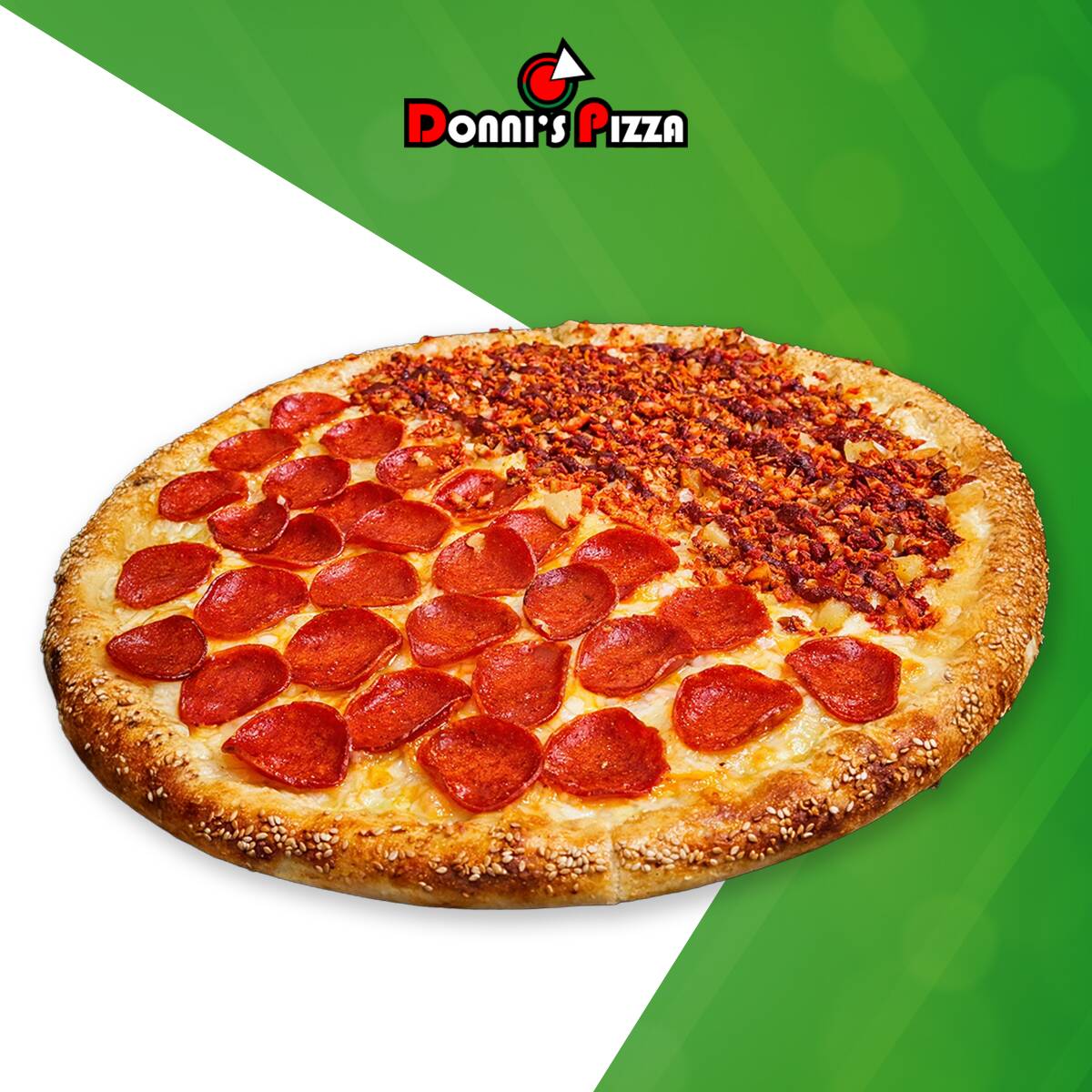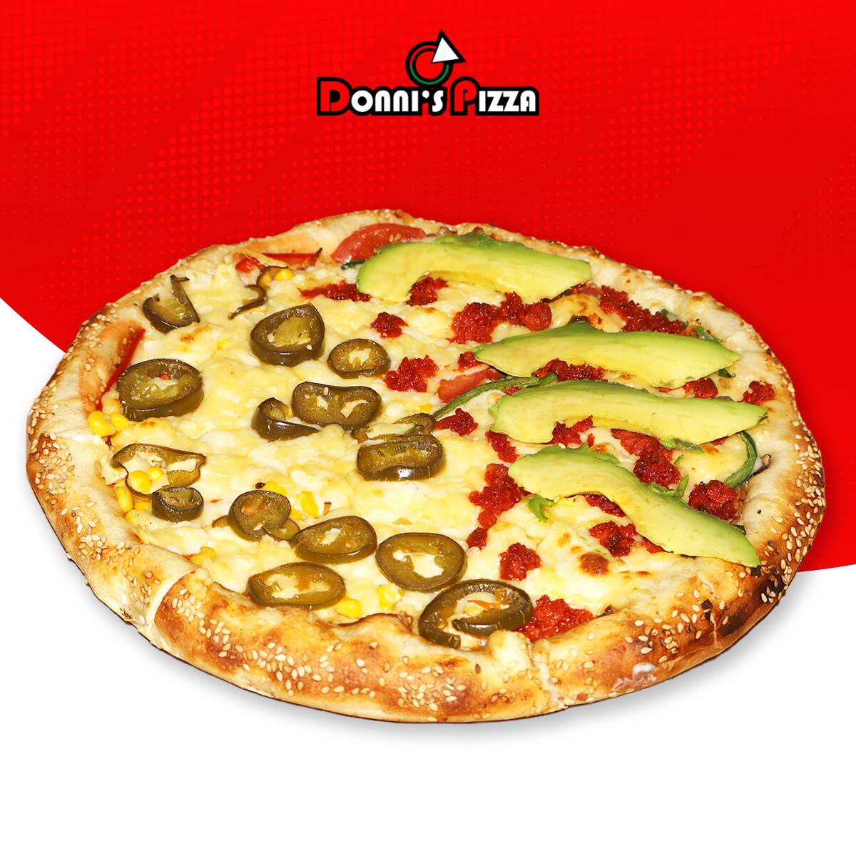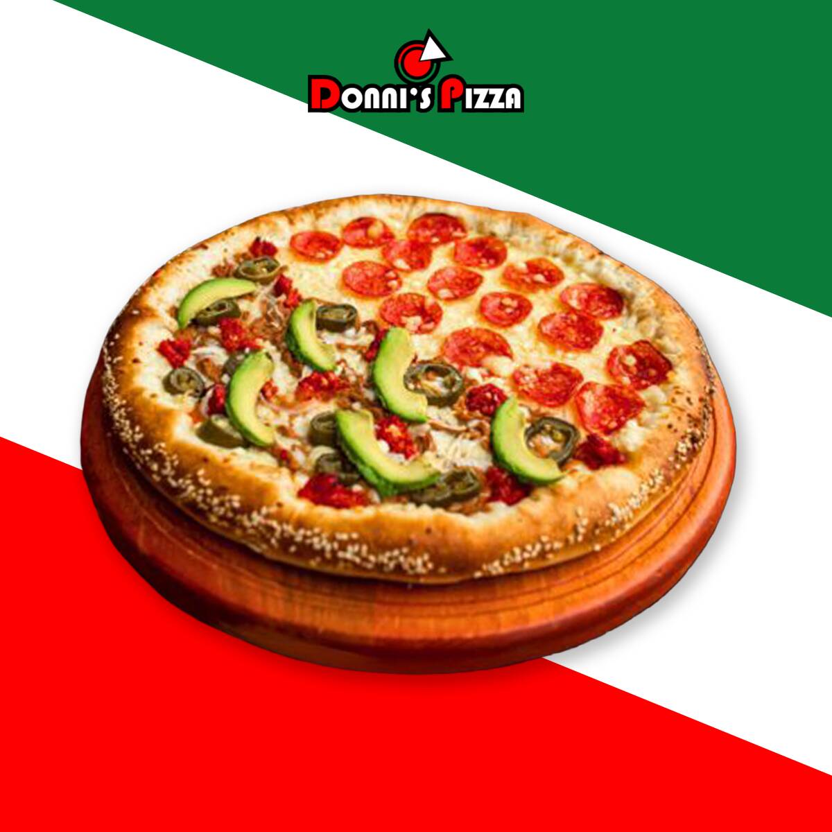 1 Pizza Mediana de 28 cm, 8 rebanadas, con la orilla rellena de queso crema y cubierta de ajonjolí (1 a 2 especialidades a elegir).