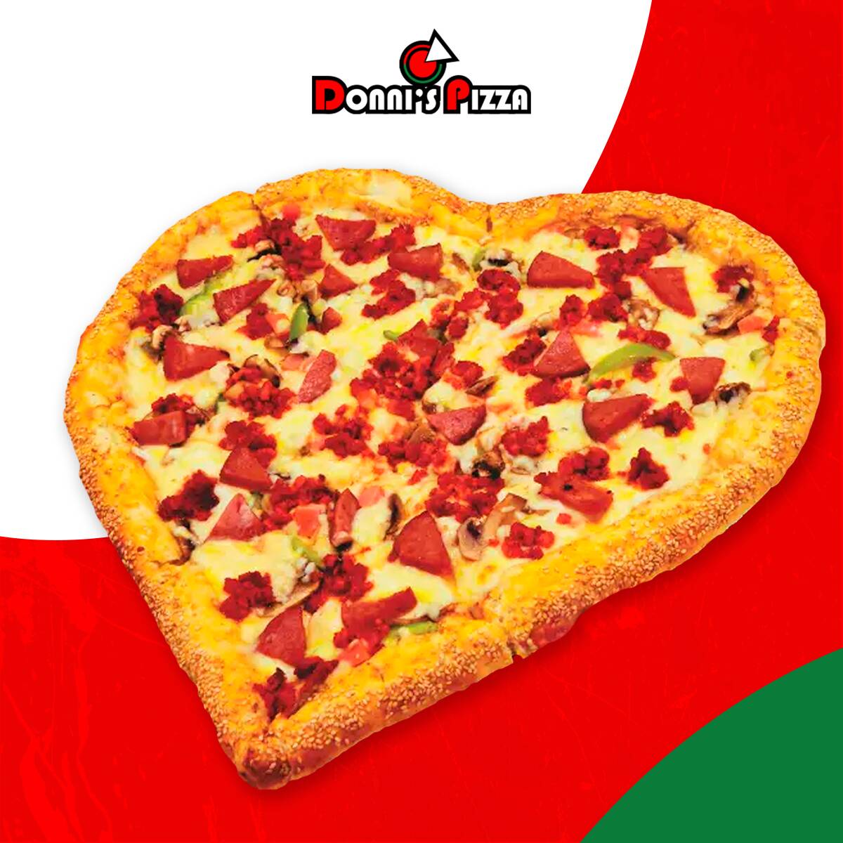1 Pizza en forma de corazón. Puede escoger hasta 2 especialidades. Orilla rellena de queso crema y cubierta de ajonjolí