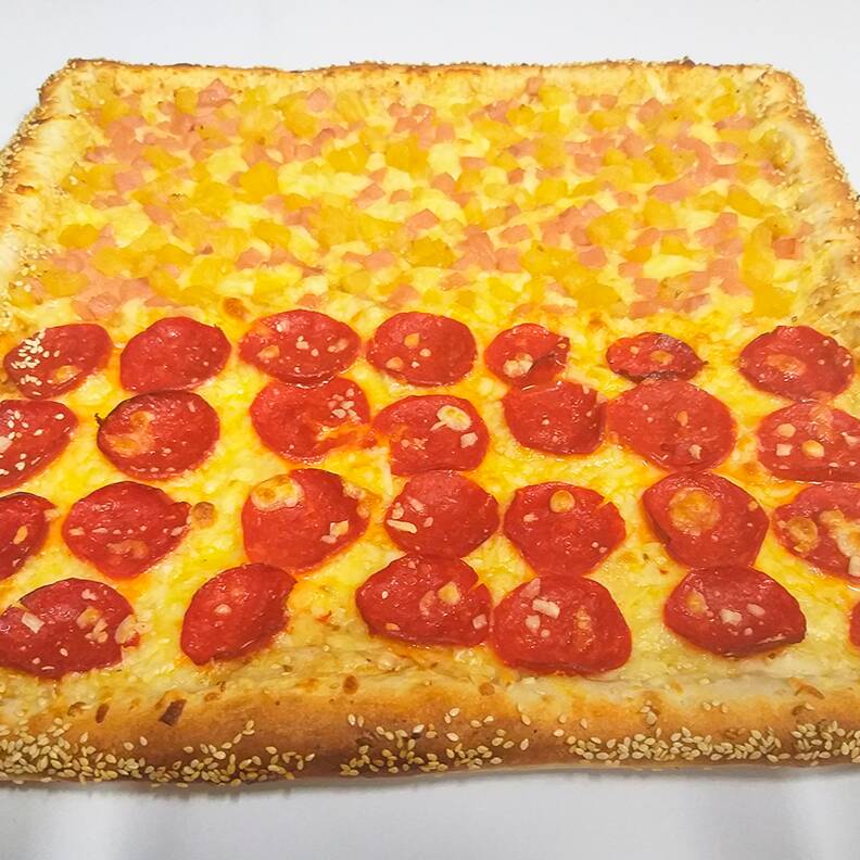 1 Pizza Cuadrada de 16 rebanadas, con la orilla rellena de queso crema y cubierta de ajonjolí (1 a 2 especialidades a elegir)