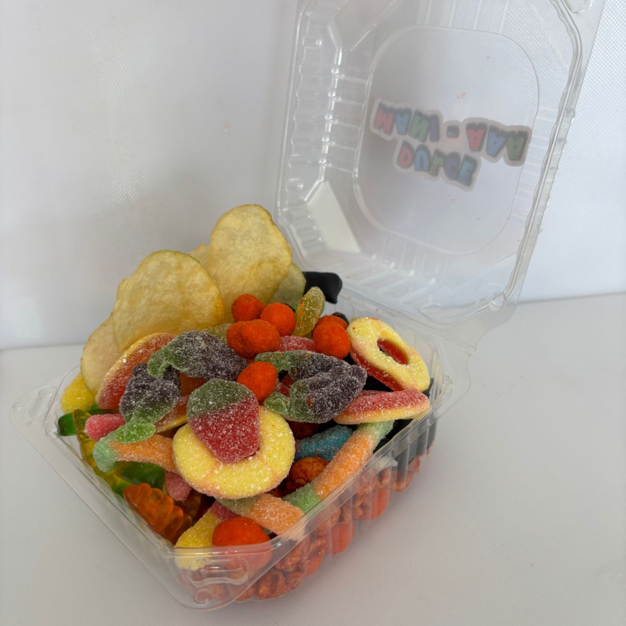 Charola llena de 3 variedades de gomitas, 3 de cachuates, papa salada y adobada, acompañado con salsa valentina y botanera