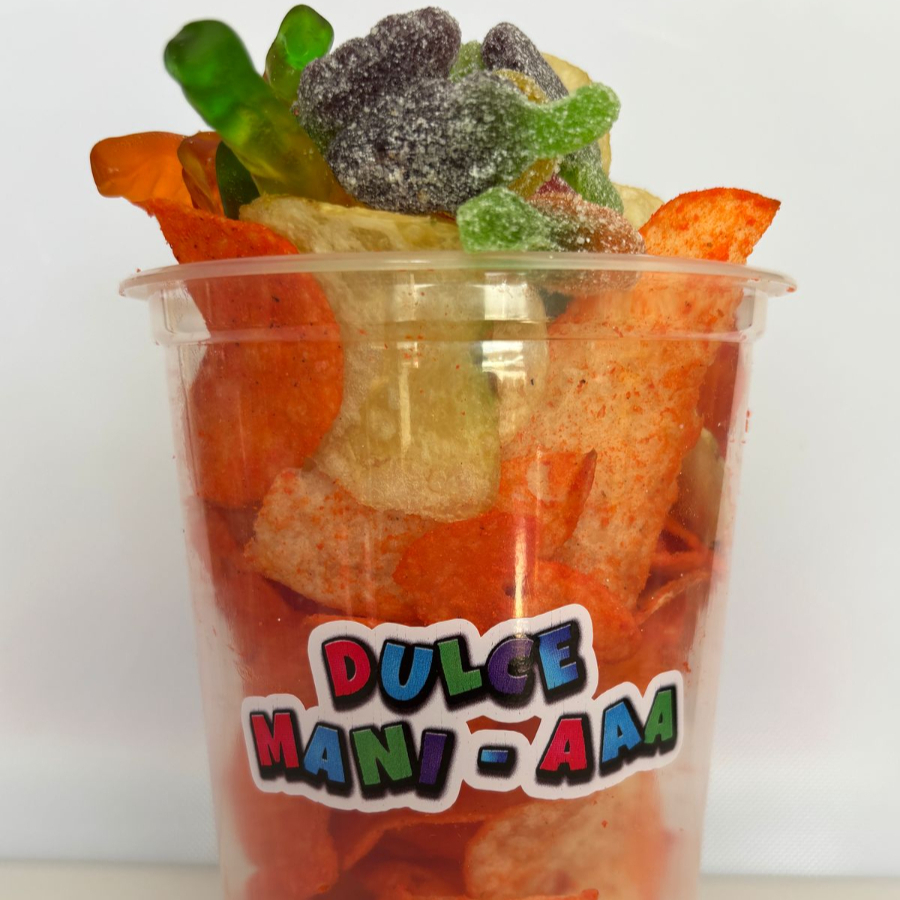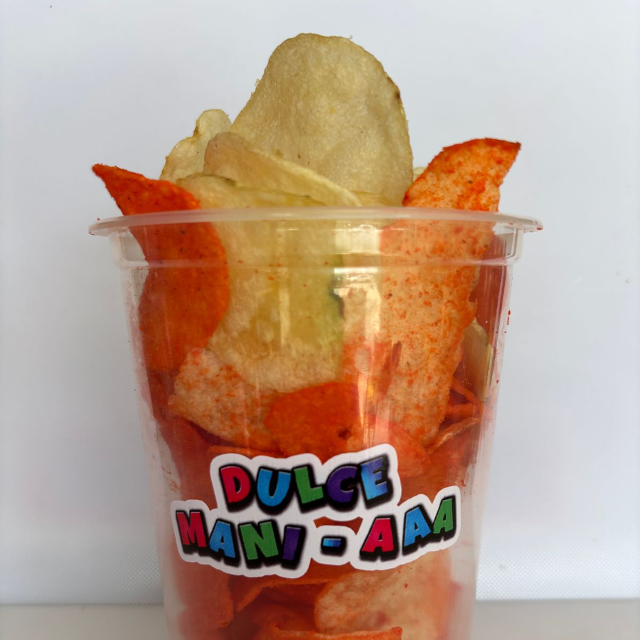 Vaso de papas acompañado por dos variedades de gomitas y una variedad de cachuates