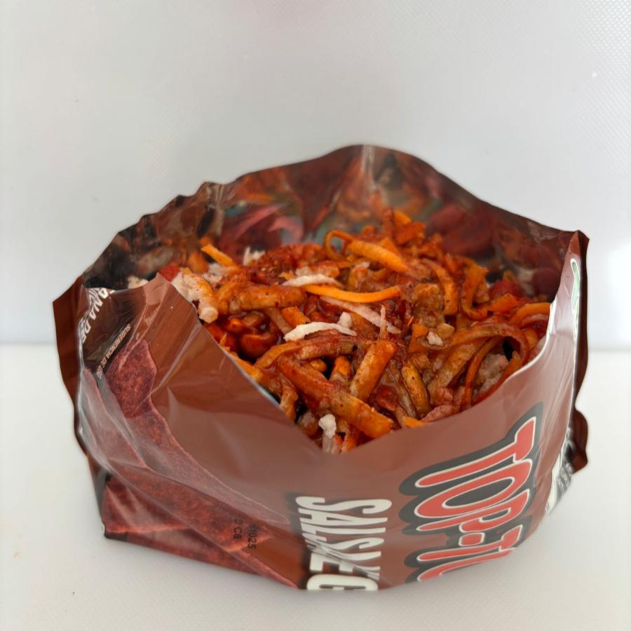 Ricos top tops de salsa negra o hot chili, acompañados por jicama, zanahoria, 2 tipos de cachuates y 2 tipos de gomitas