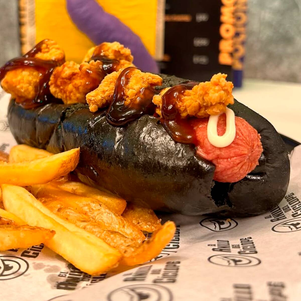 Hot dog de pan negro con salchicha de 22 cm acompañado de nuestra salsa volcánica papas y cerebritos (mini boneless).