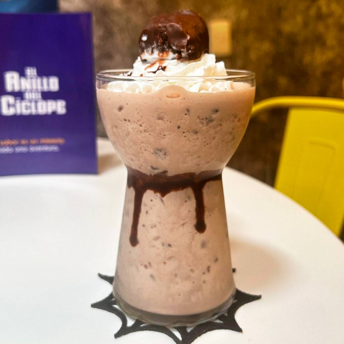 Malteada de chocolate adornada con chocolate líquido y crema batida.