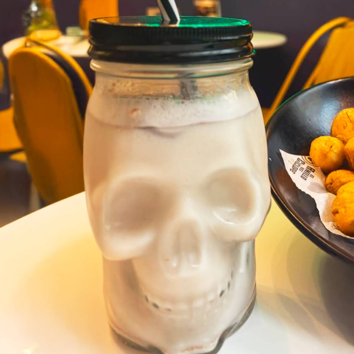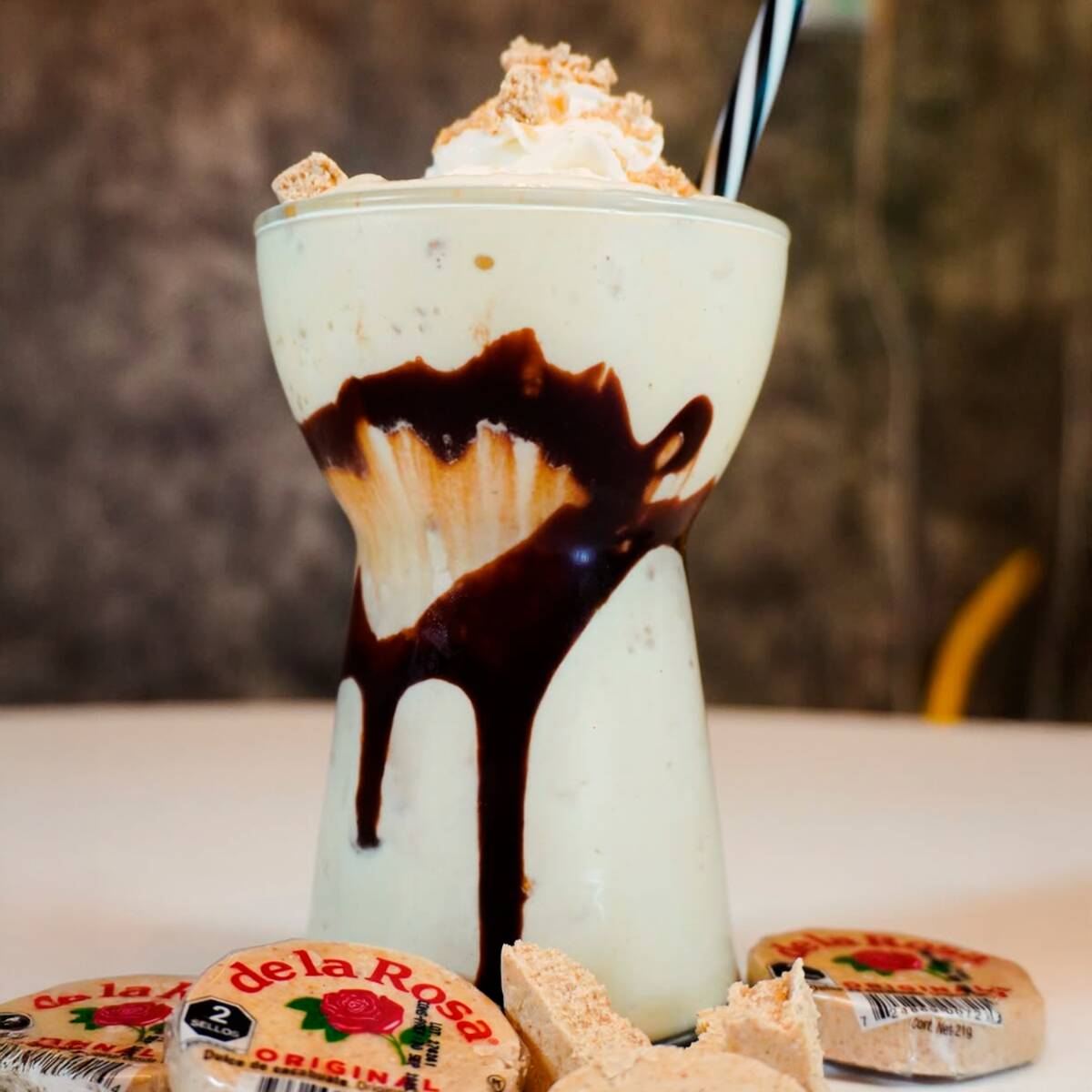 Malteada de mazapán adornada con chocolate líquido y crema batida.