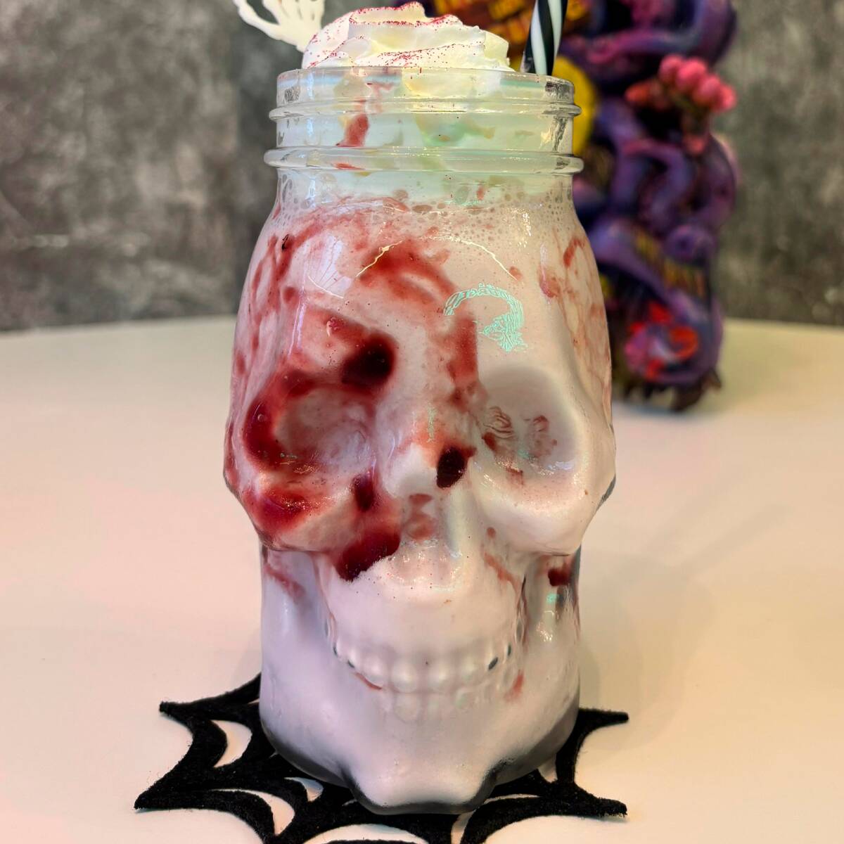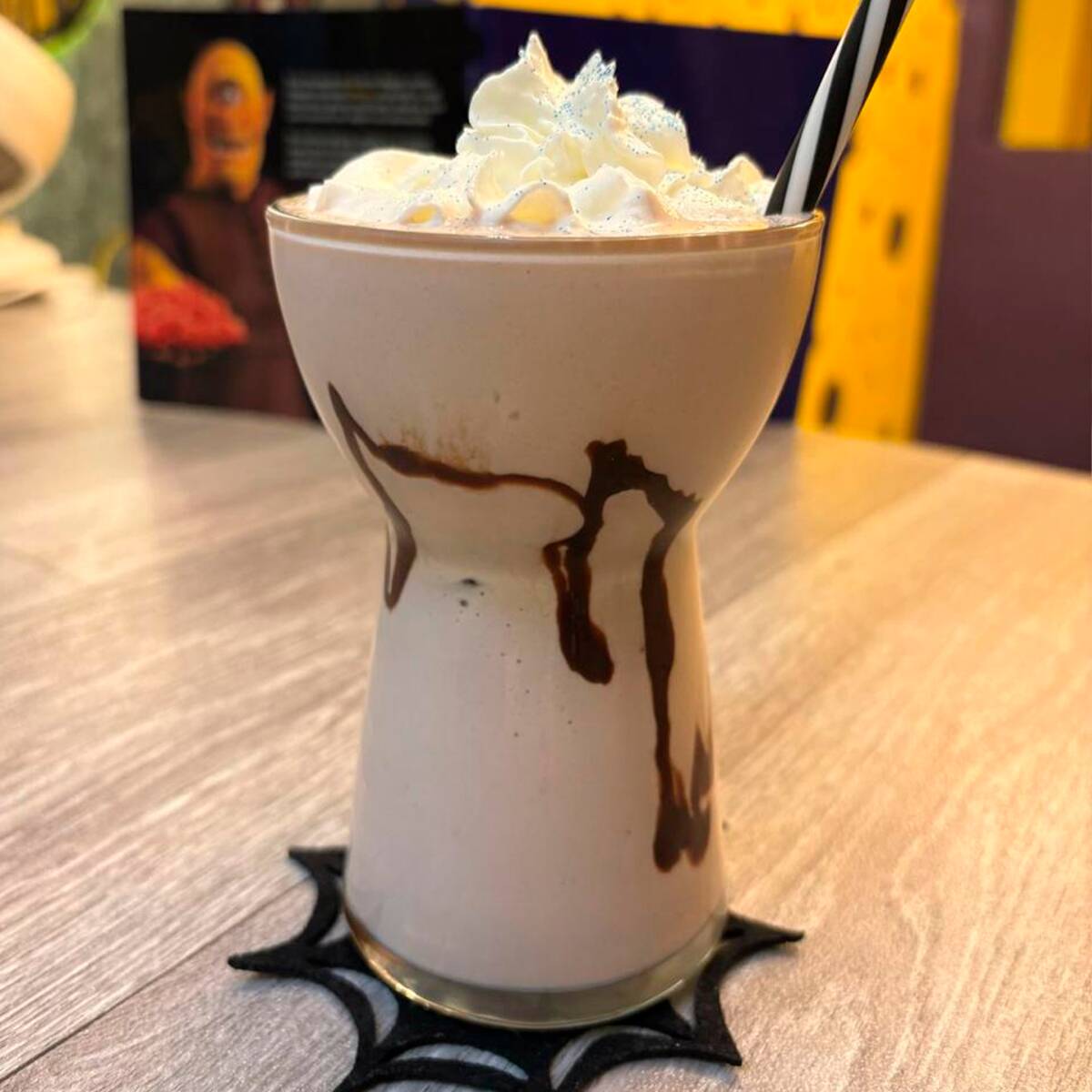 Malteada de gansito adornada con chocolate líquido y crema batida.