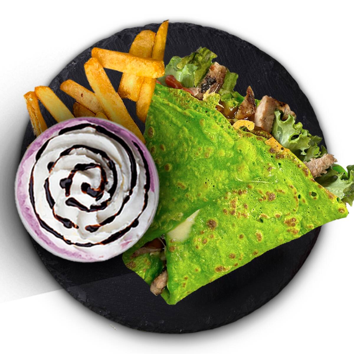 Crepiburger de pollo (100 g), por dentro queso gouda, lechuga y aderezo a elegir. acompañada de papas a la francesa.