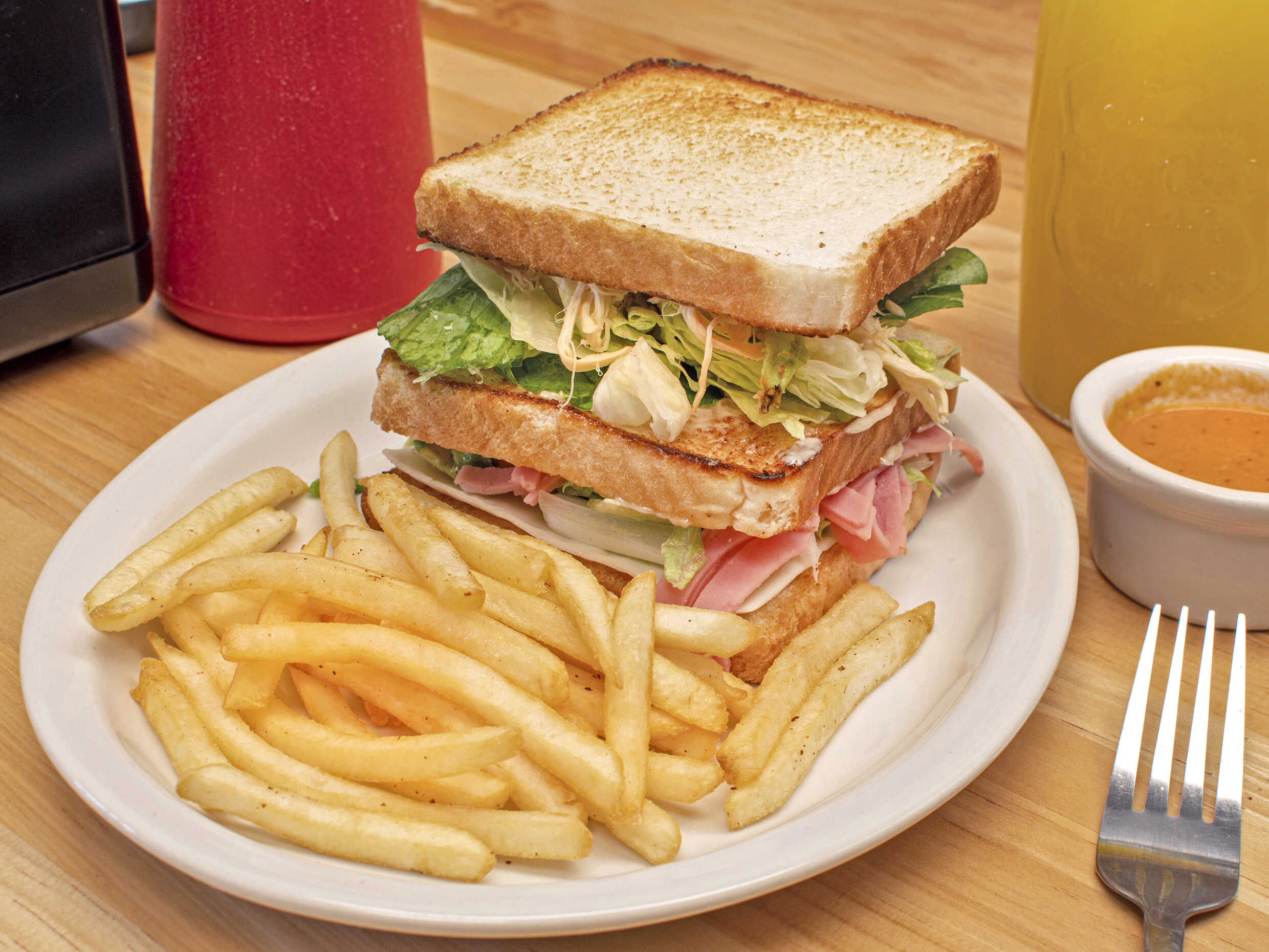 Sándwich de 2 pisos de pollo y jamón con queso tipo manchego, lechuga, aguacate, mayonesa acompañado de papas a la francesa.