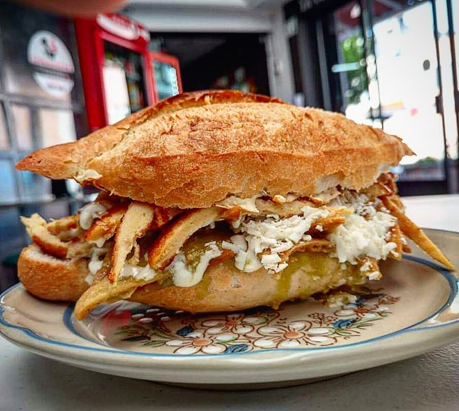 Rico bolillo relleno de nuestros ya famosos chilaquiles rojos o verdes con frijoles, queso rallado, lechuga, aguacate y crema.