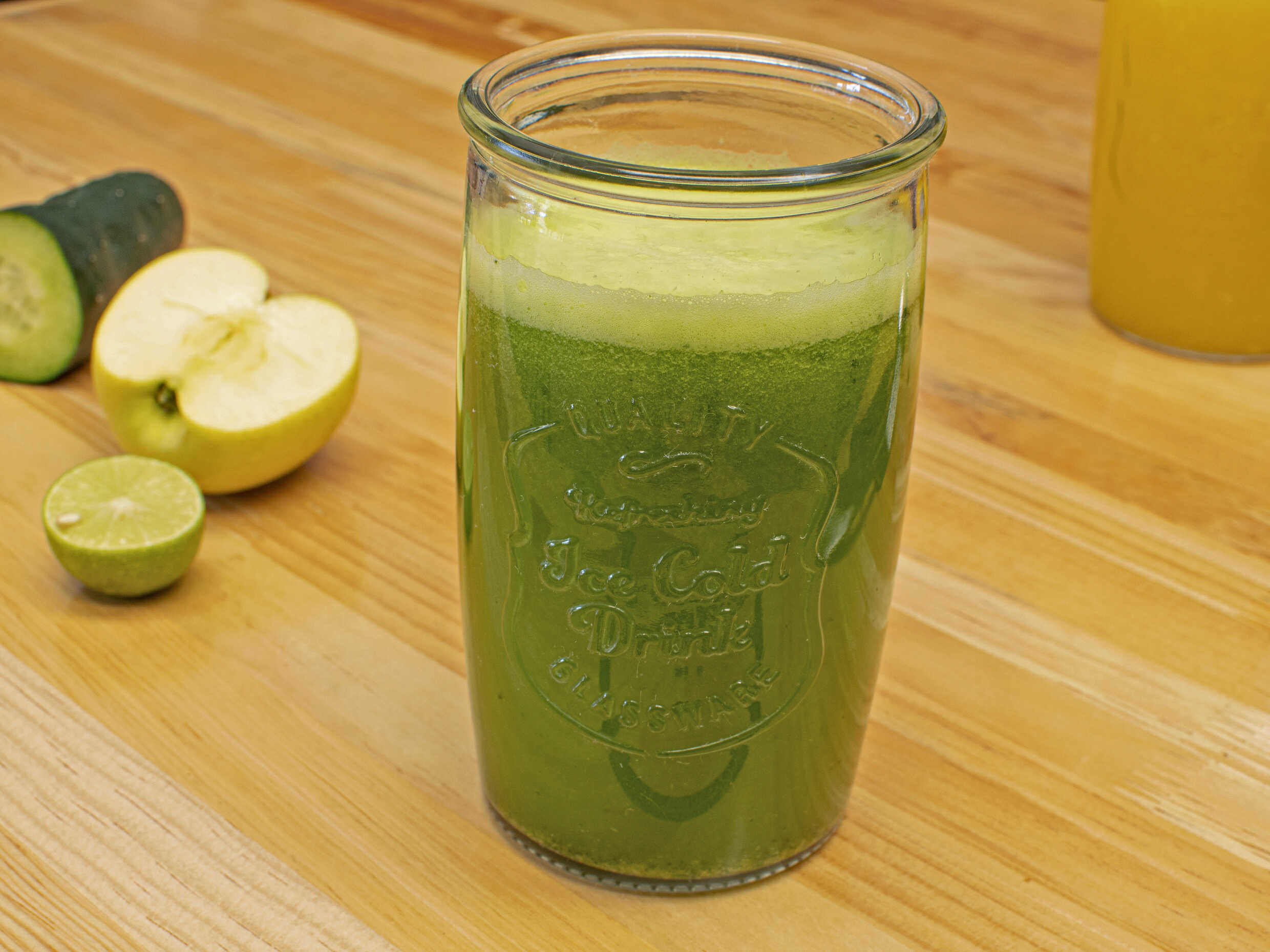 Jugo o agua, espinacas, manzana, pepino y limón.