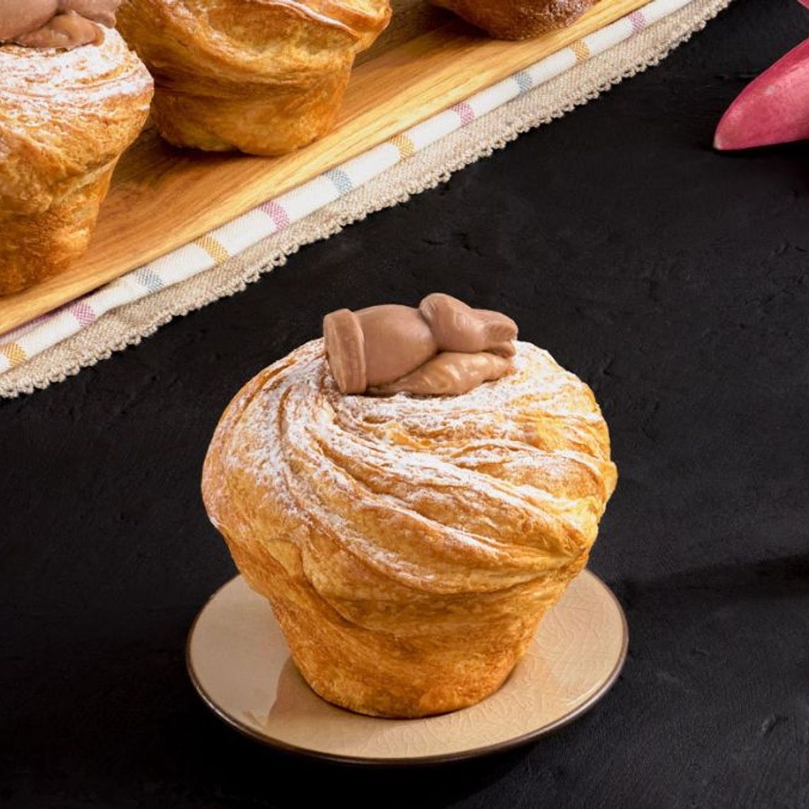 ¡Combinación de croissant y muffin! Masa con intenso sabor a mantequilla y textura crujiente, relleno con una deliciosa crema de chocolate de leche, decorado con un chocolate de Conejos.