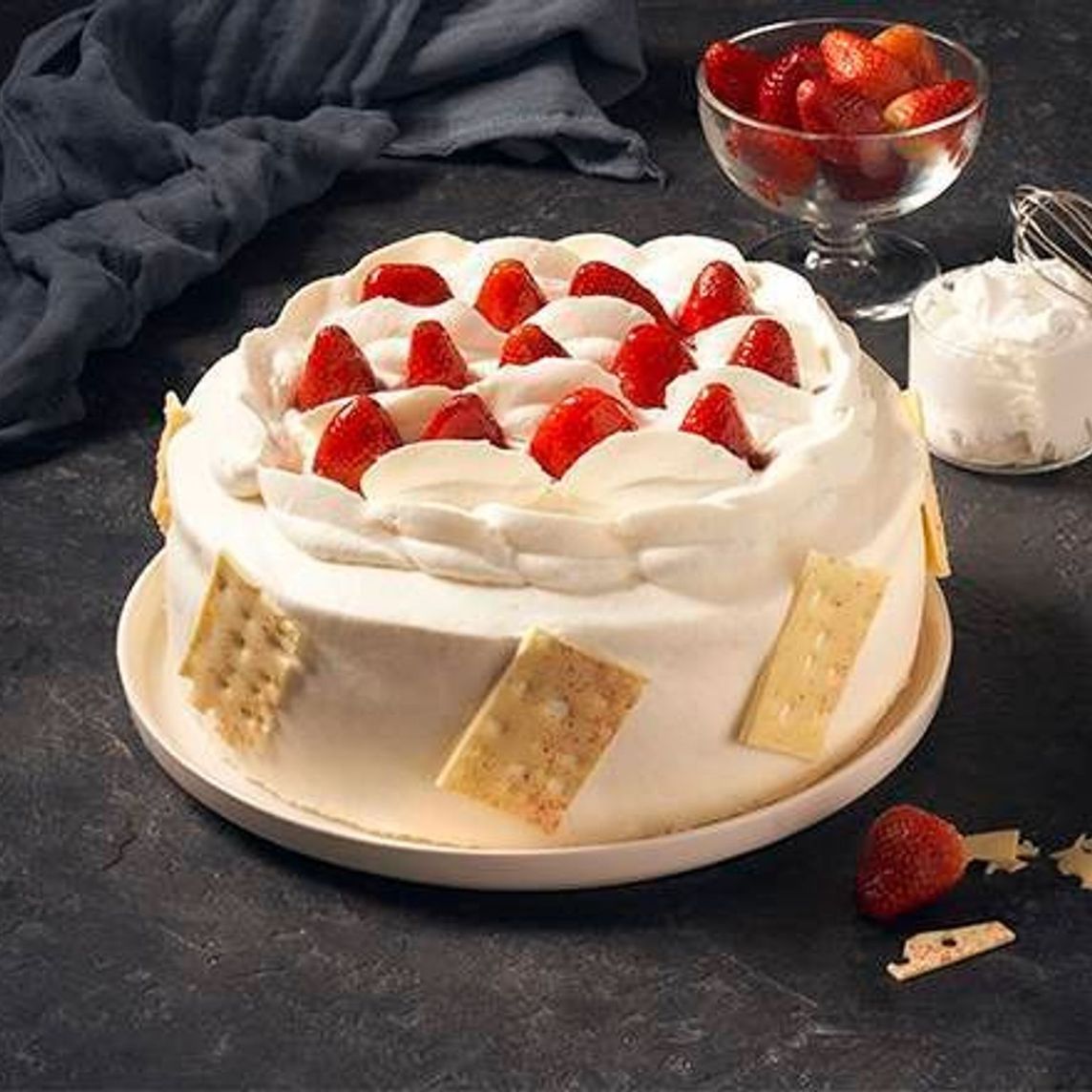 Pastel de vainilla, relleno y decorado con fresas frescas y cremoso chantilly.