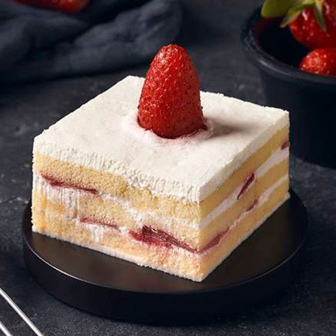 Pastel de vainilla, con exquisito relleno y decorado de fresas frescas y chantilly. (125 g)