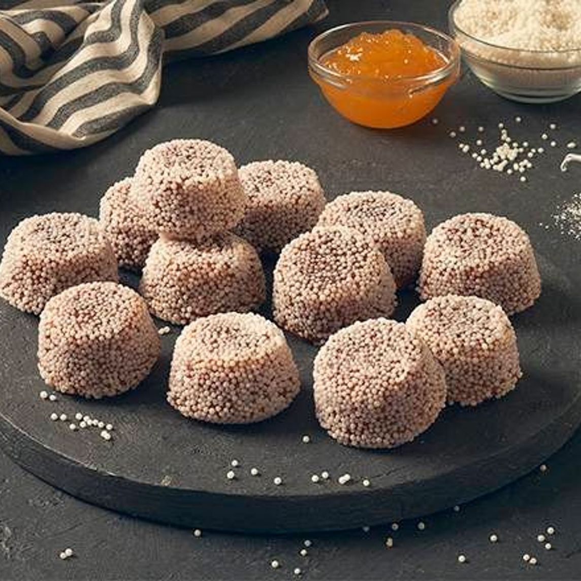 12 mini Garibaldis, deliciosos panqués de vainilla cubiertos con pulpa de chabacano 100 porciento natural.