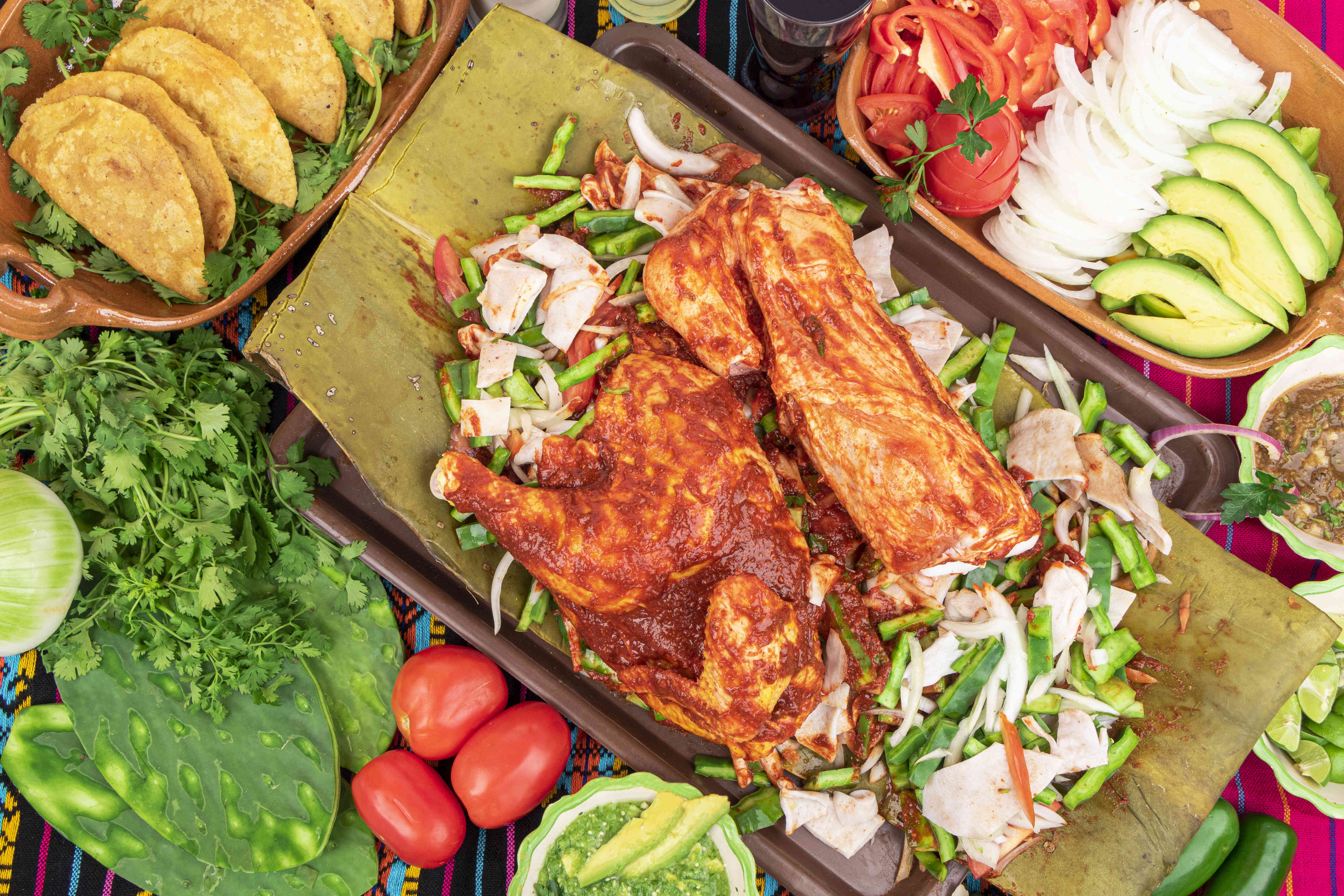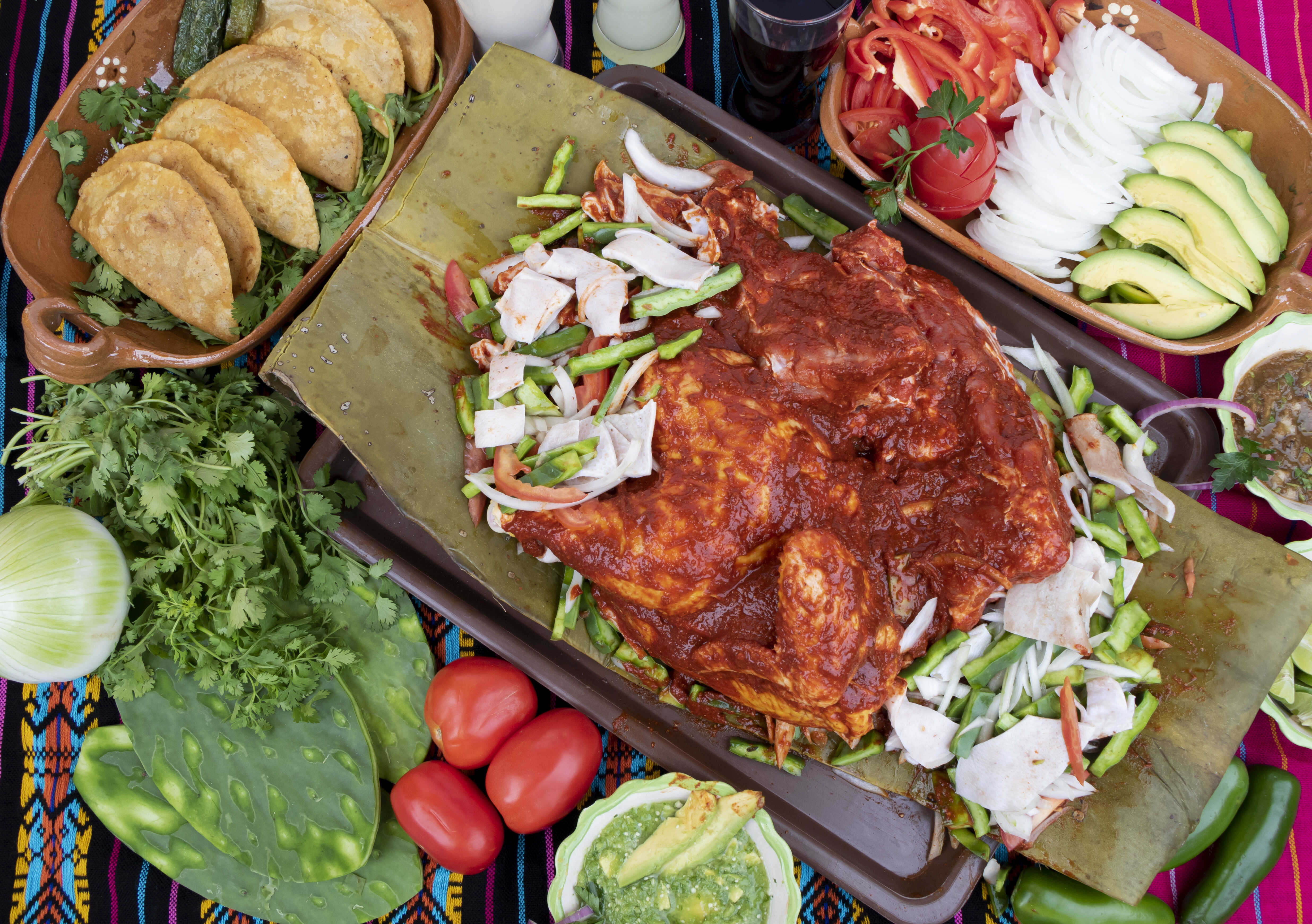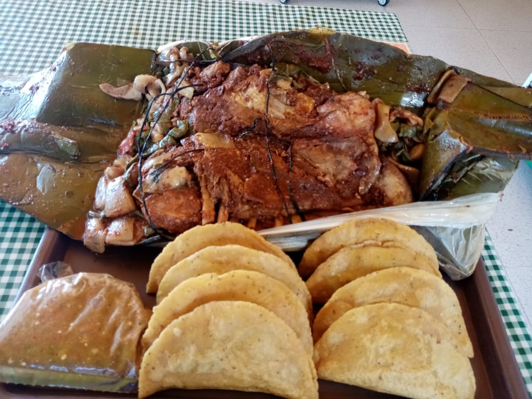 Un chamorro y medio pollo adobado en guajillo con cueritos y nopales ( envuelto en penca de maguey). ( 5-6) adultos). (Gratis 4 quesadillas de ximbo y 1 paquete de tortillas).