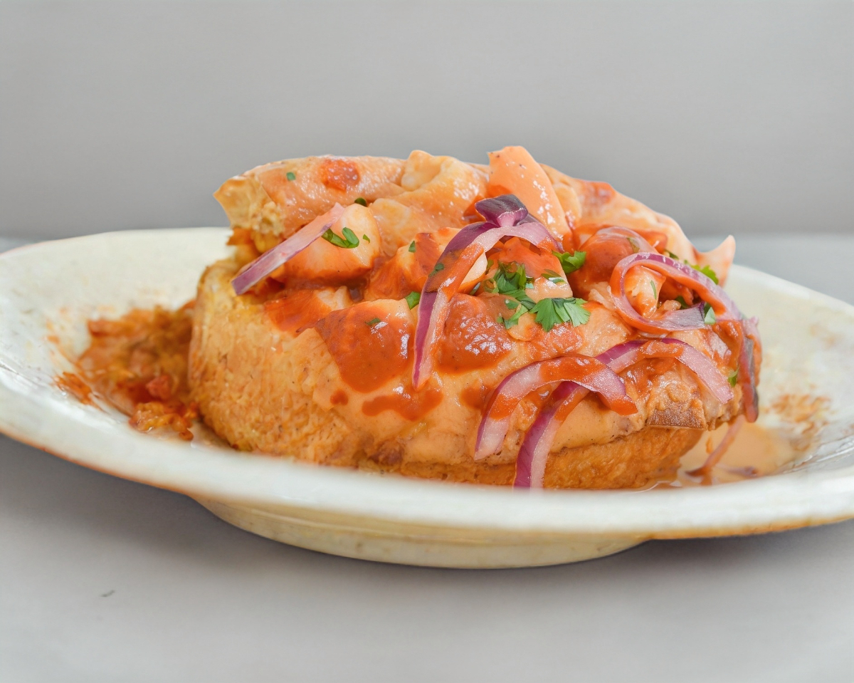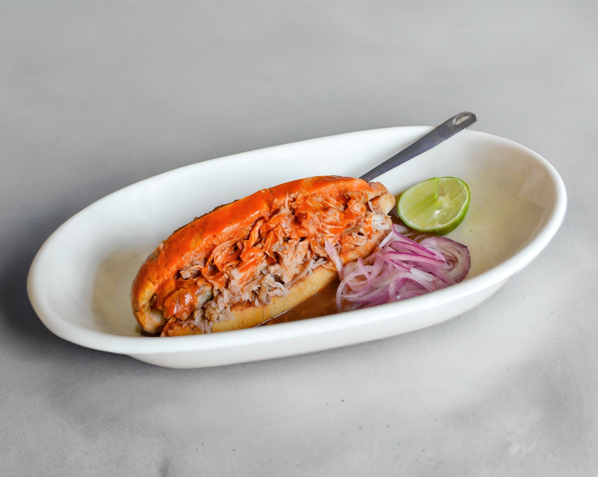 Birote salado de Guadalajara, relleno con carnitas de pollo. Salsa de jitomate (la salsa se envía aparte) SERVICIOS que incluye: cebolla desflemada morada, cebolla desflemada blanca, limones, salsa picante.