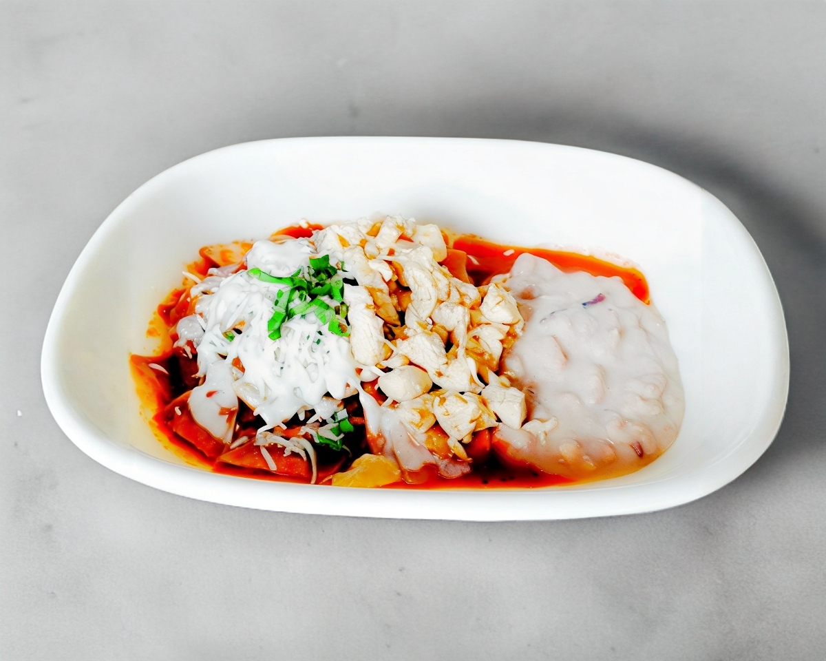 Totopos bañados con salsa de jitomate (la salsa de jitomate se envía aparte) acompañados con pollo y frijoles. Incluye: cilantro, cebolla, queso, crema.