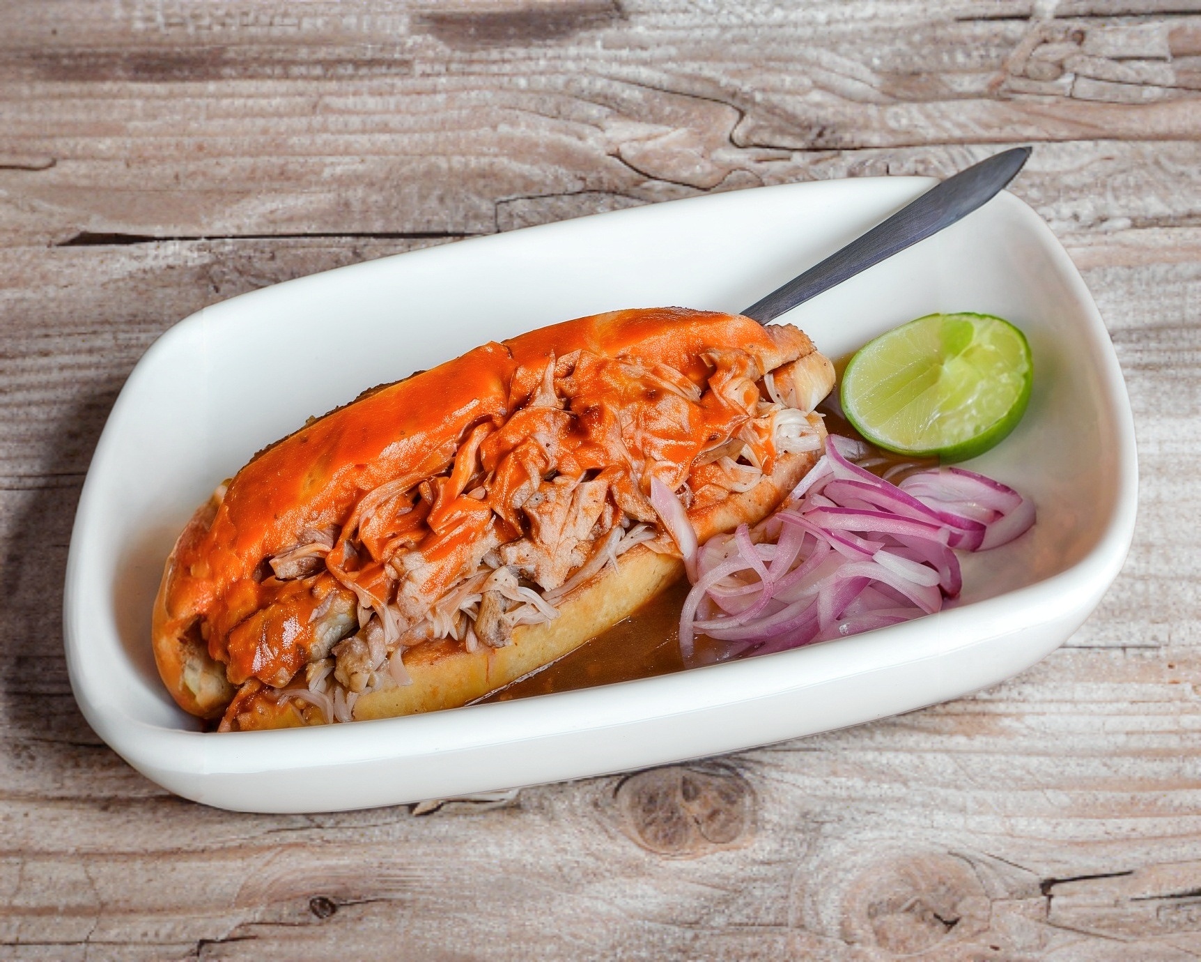 Birote salado de Guadalajara, relleno con carnitas de cerdo. Salsa de jitomate ( la salsa se envía parte). SERVICIOS que incluye: cebolla desflemamda morada, cebolla desflemada blanca, limones y salsa picante.