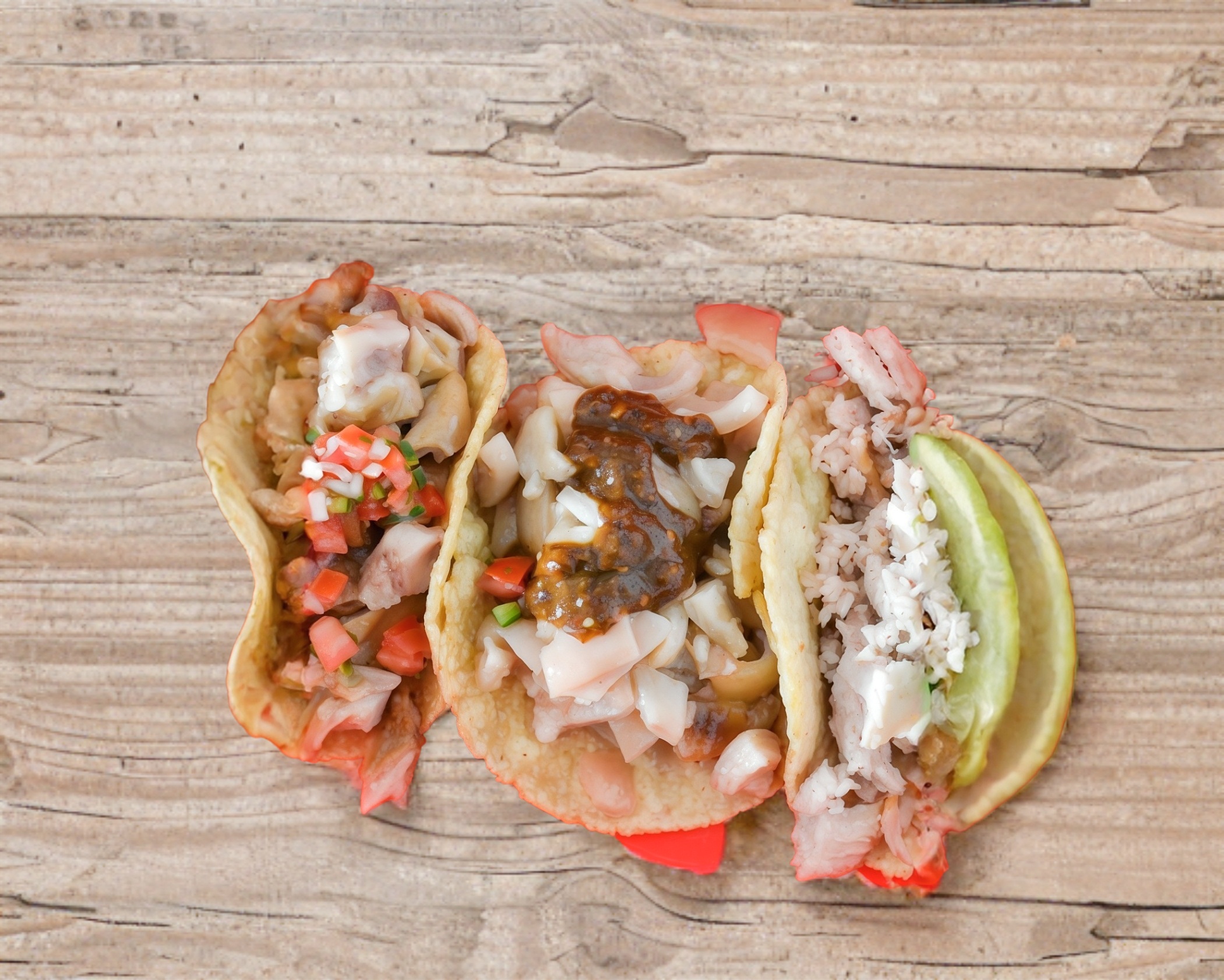 Elaborado con tortilla de comal relleno de papa y pollo. SERVICIOS que incluye: cebolla desflemada morada, cebolla desflemada blanca, limones, salsa picante, salsa de jitomate, col.