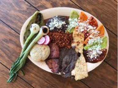 Cecina, pieza de pollo, chorizo con huevo, queso fresco, enchiladas 10 pz y frijoles.