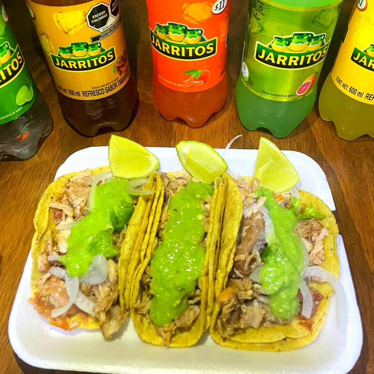 incluy salsa verde, salsa roja, cebolla con habanero, limones y tortillas