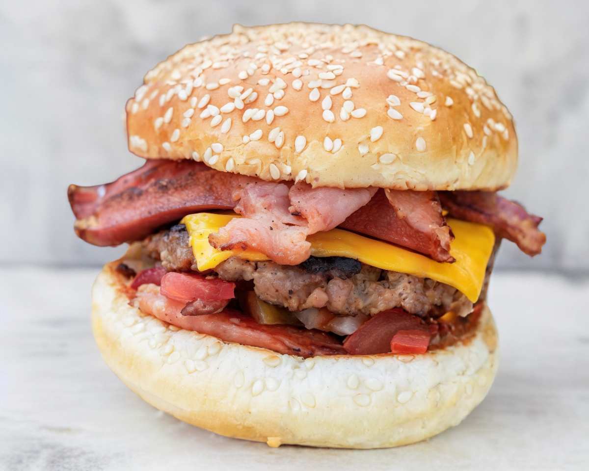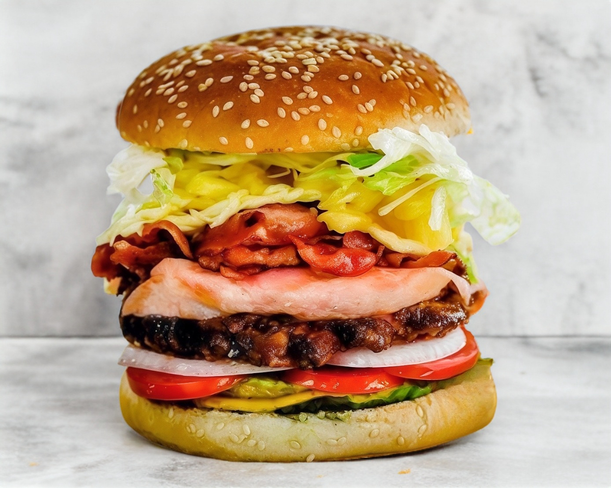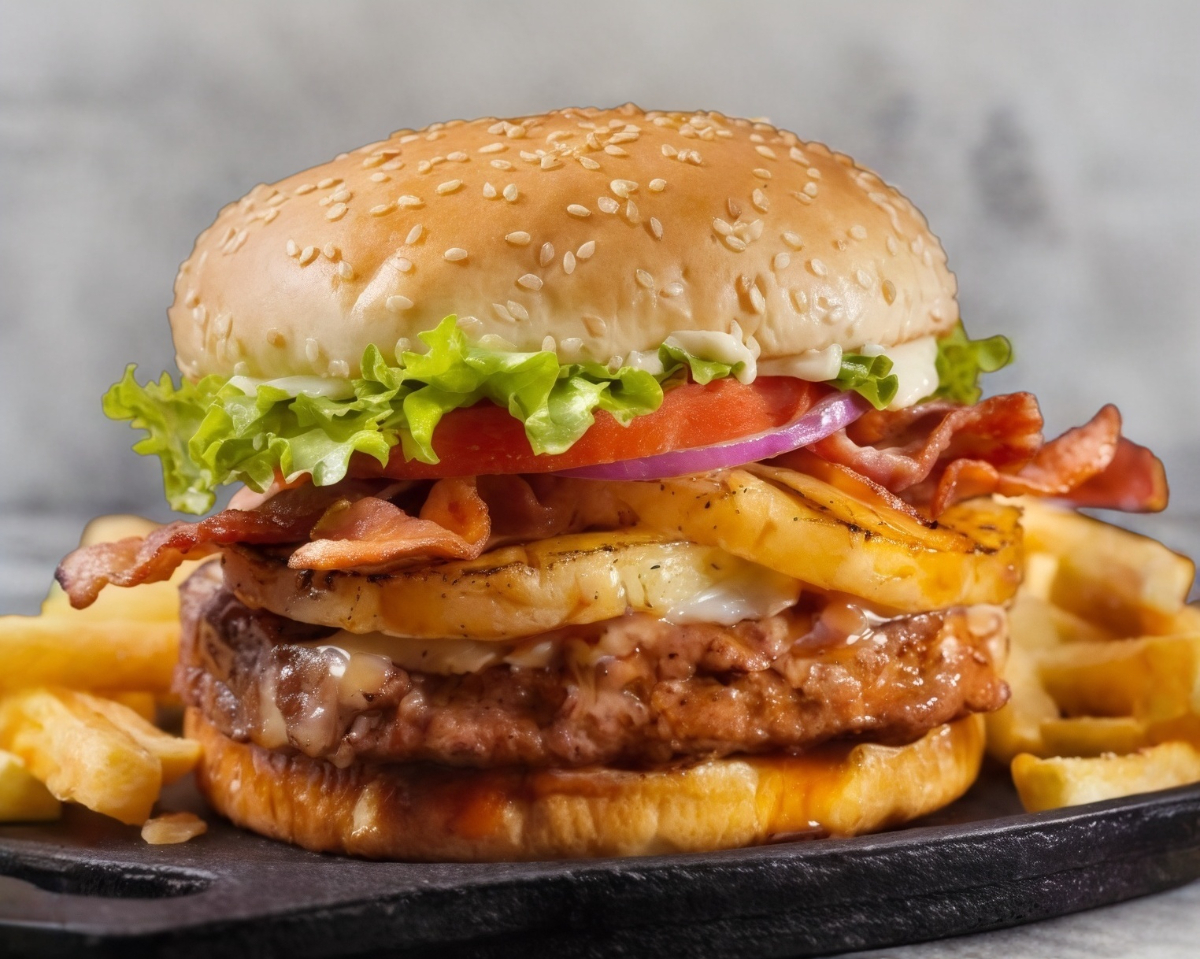 carne , piña, queso y jamón jitomate , chiles ,cebolla y aderezos.