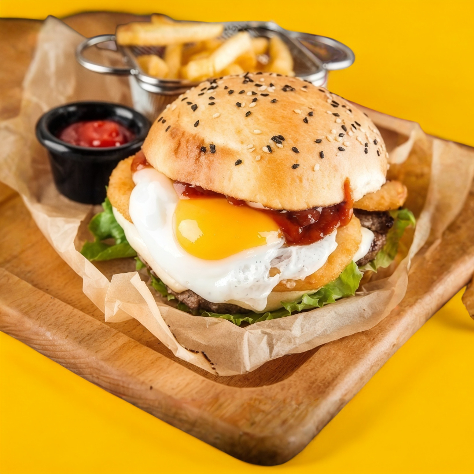 Hamburguesa doble de res, pollo o arrachera, incluye papas y refresco.
