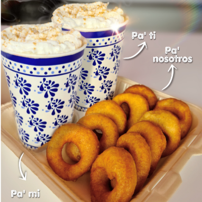 Frappé a base de rompope y leche deslactosada acompañado de un mordisko original.