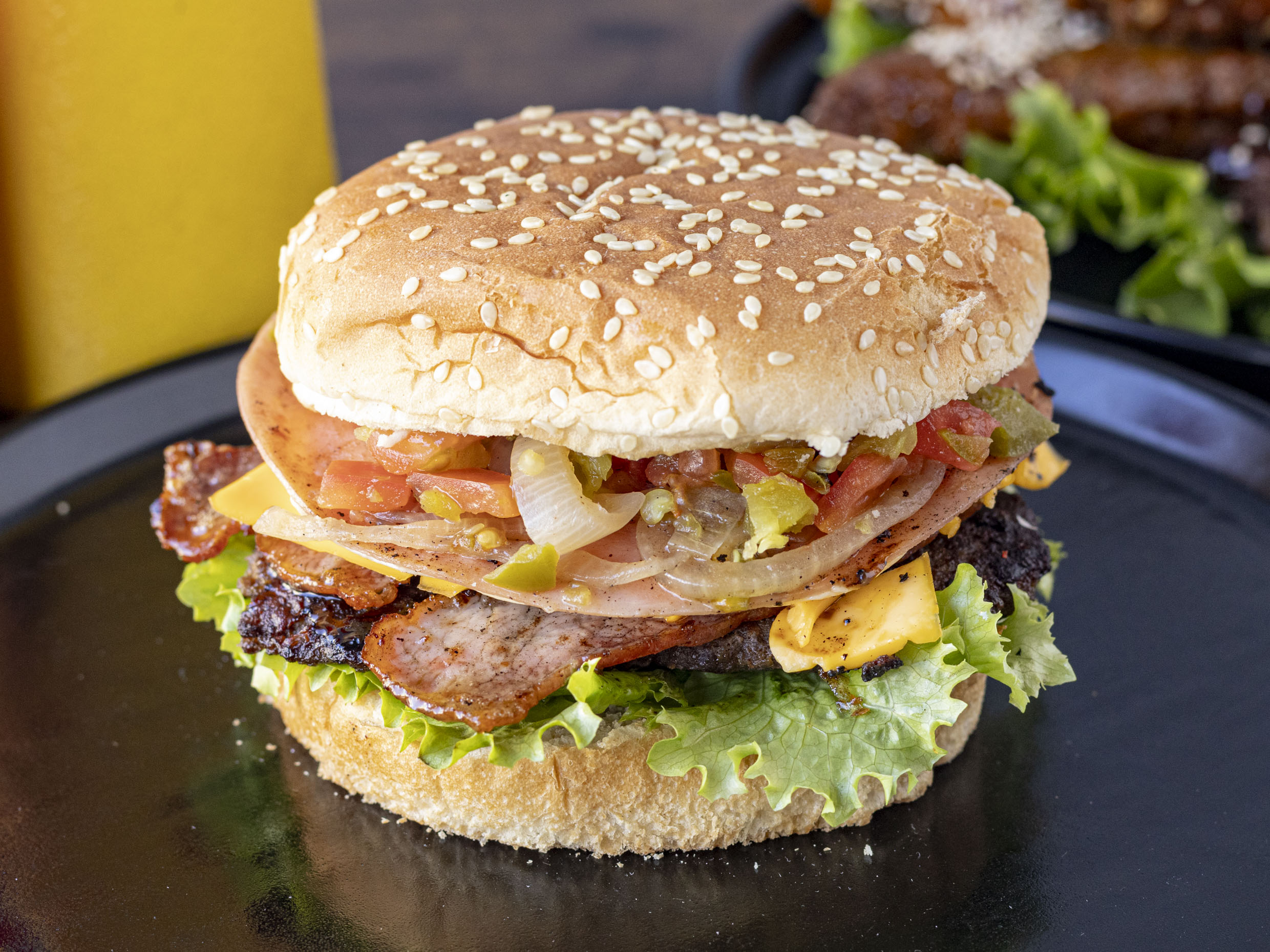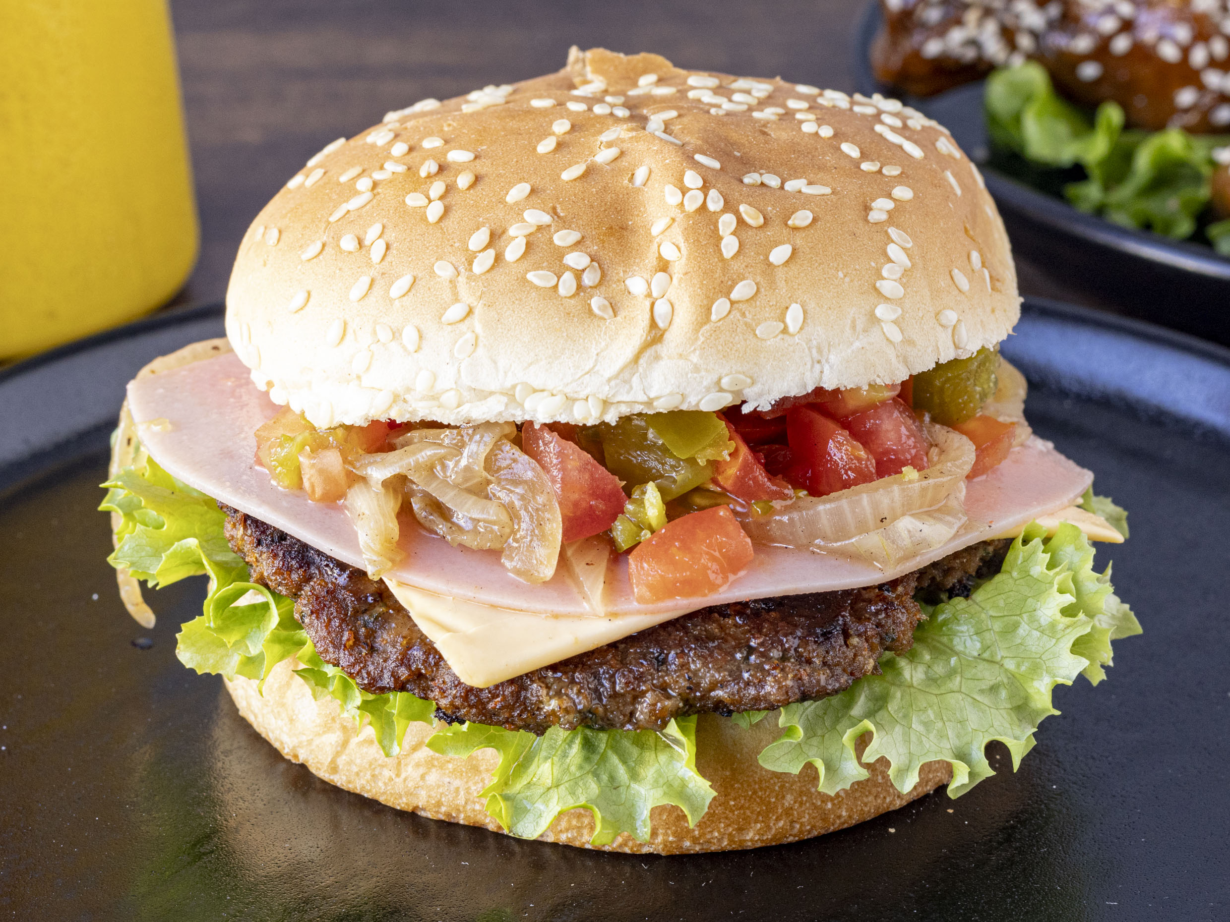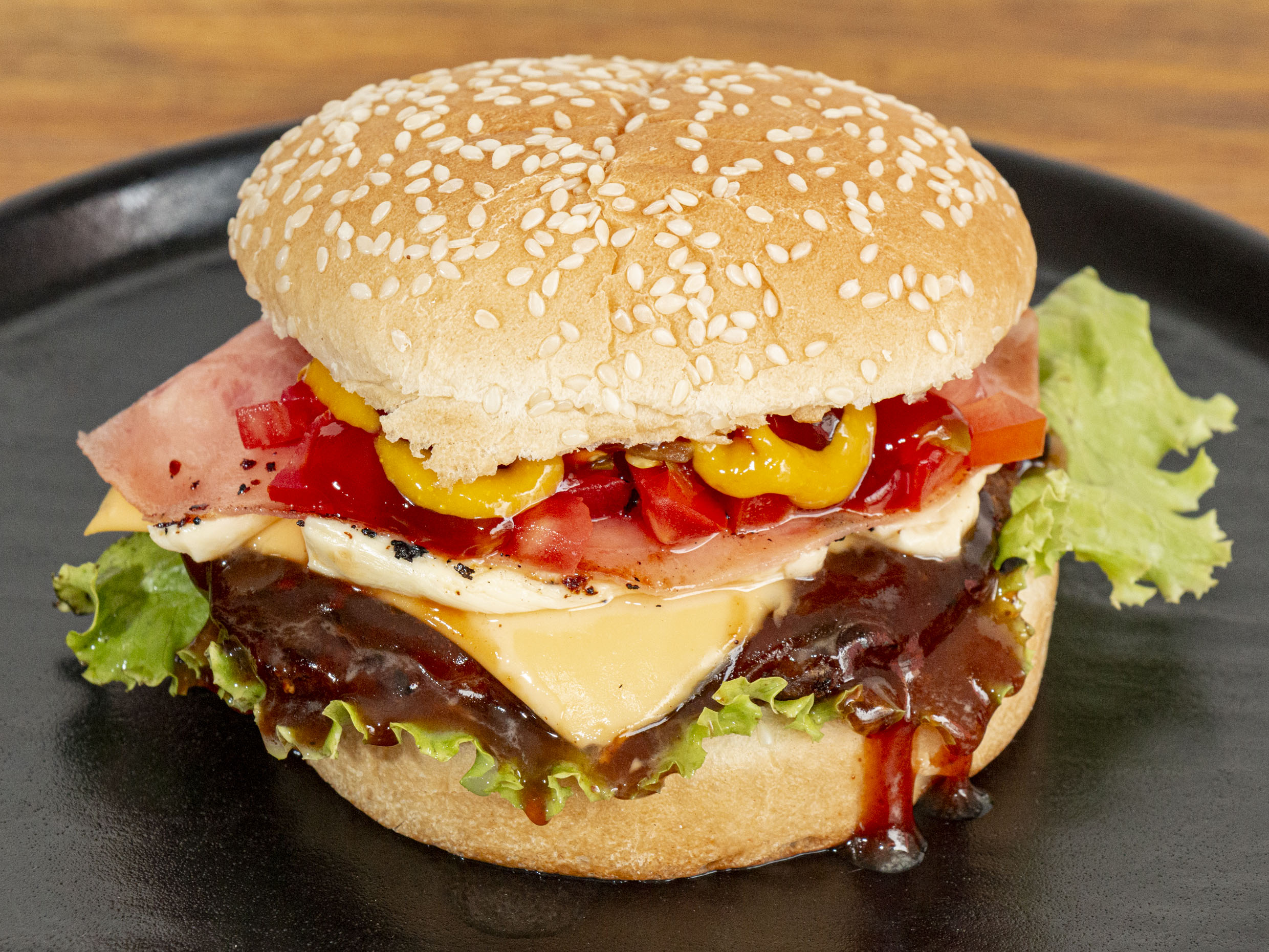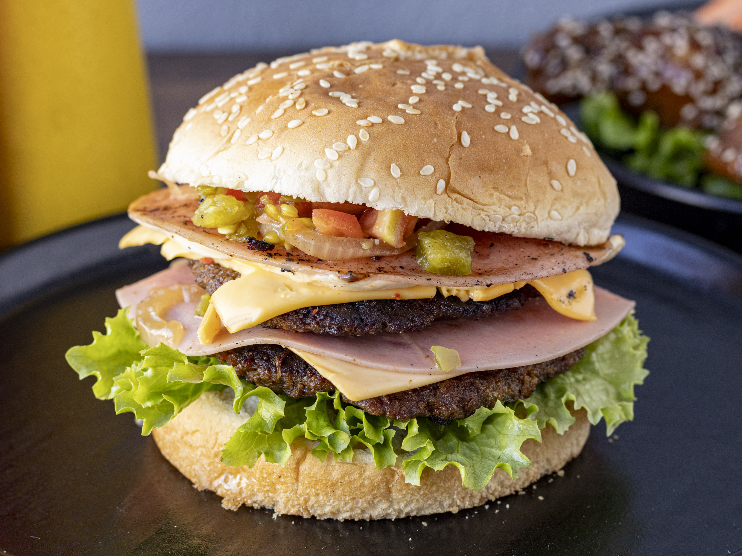 Doble carne, doble jamón, doble queso amarillo y Oaxaca, verduras y aderezos.