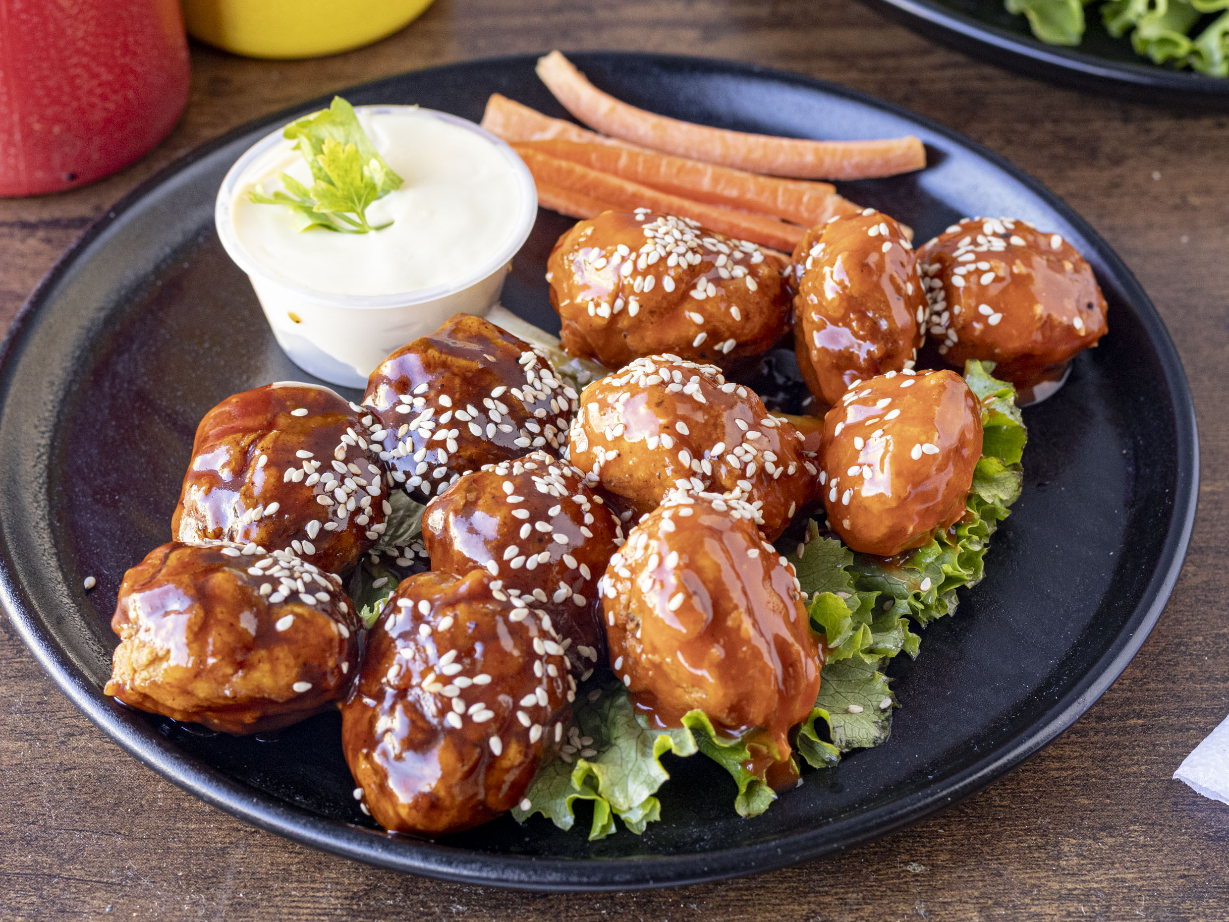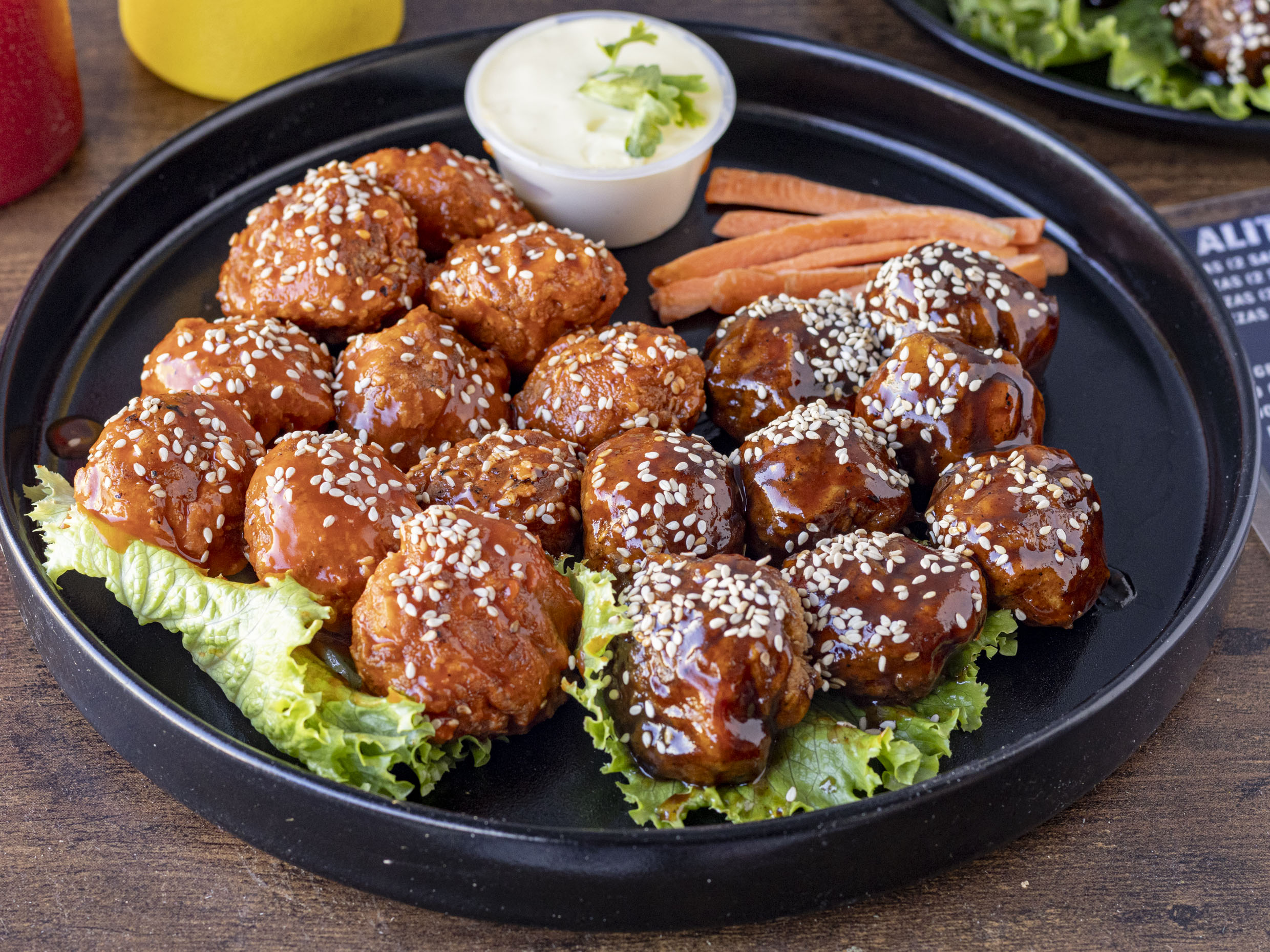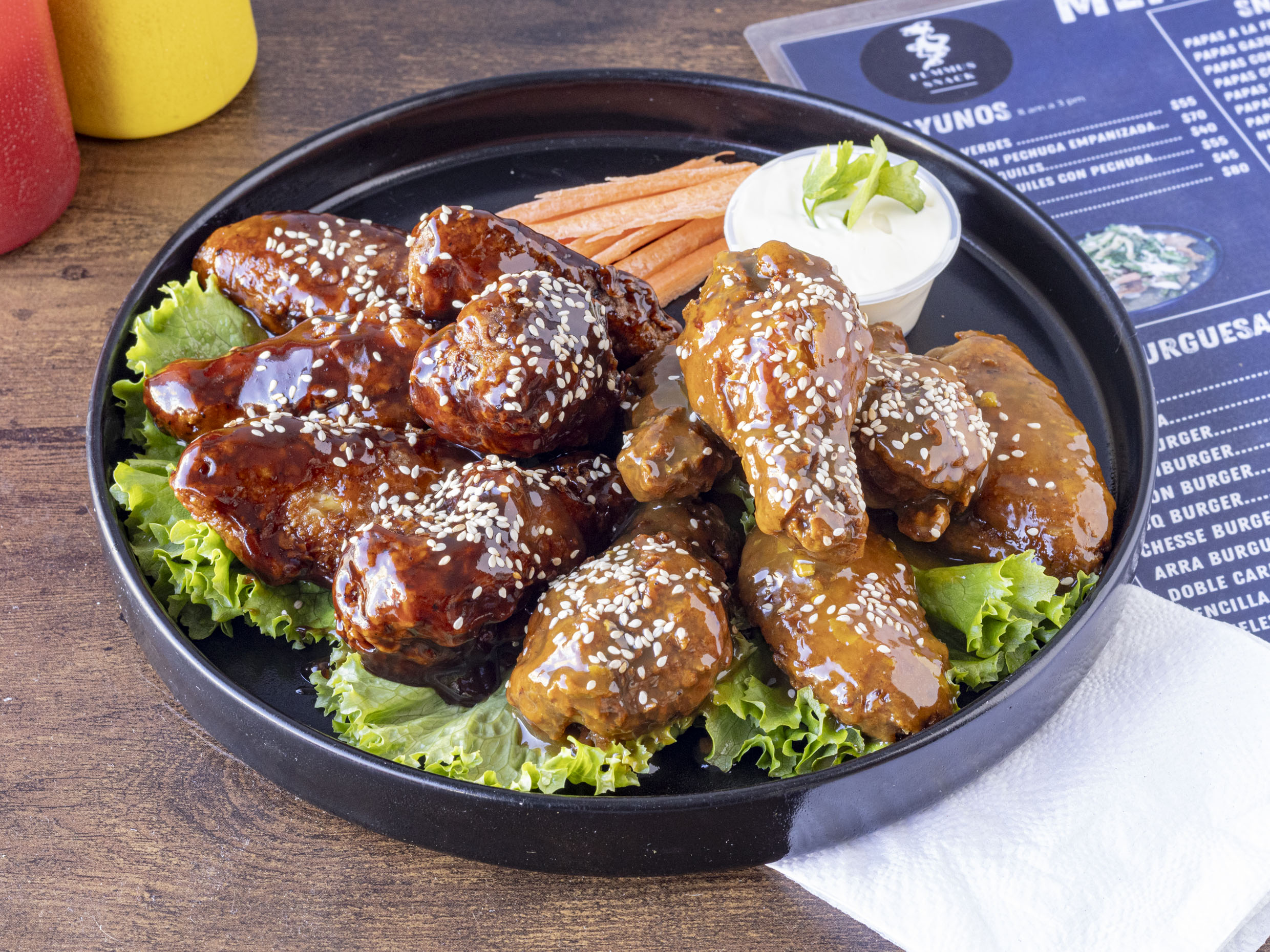 Pollo frito bañado en salsa búfalo y aderezado con ranch, acompañado de lechuga y jitomate.