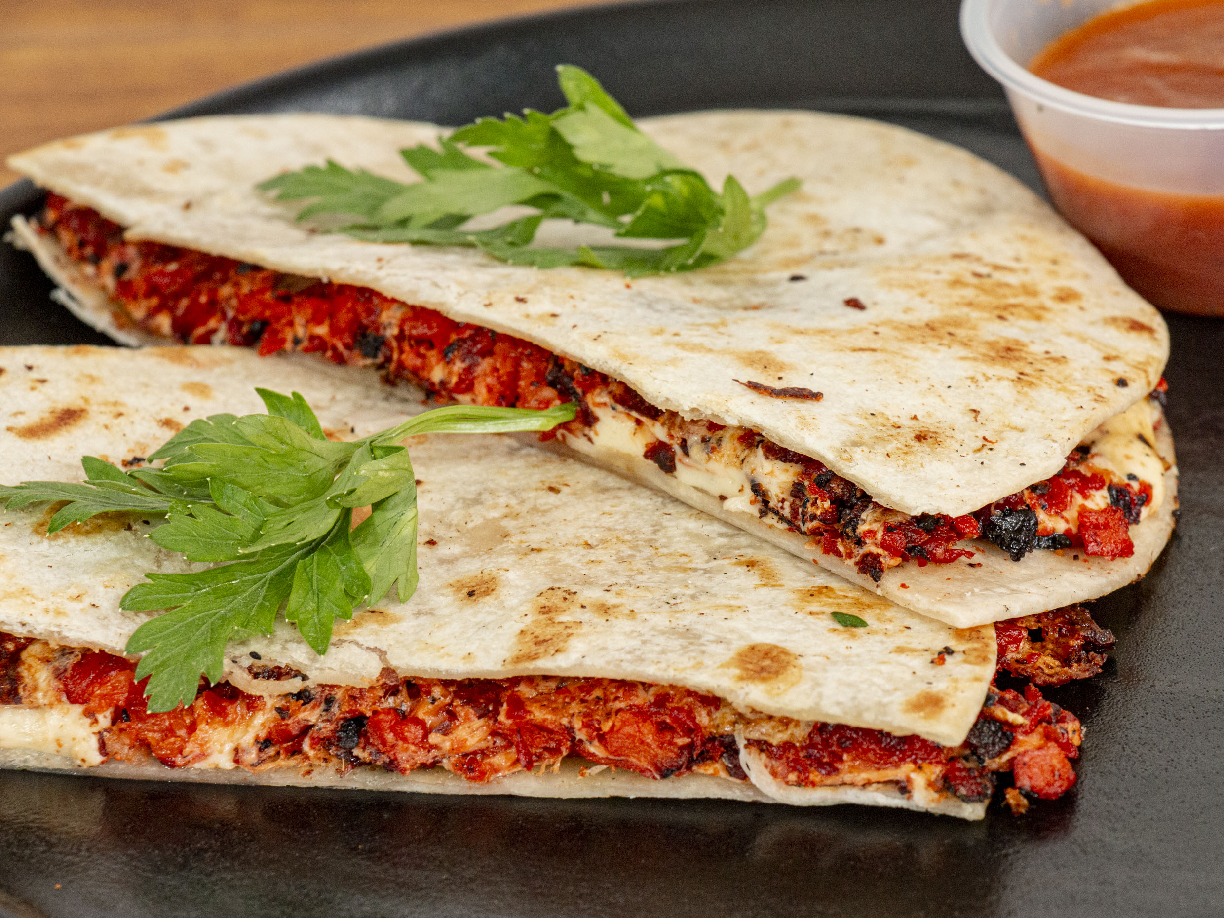 Dos tortillas de harina con queso Oaxaca y chorizo acompañadas de un delicioso guacamole.