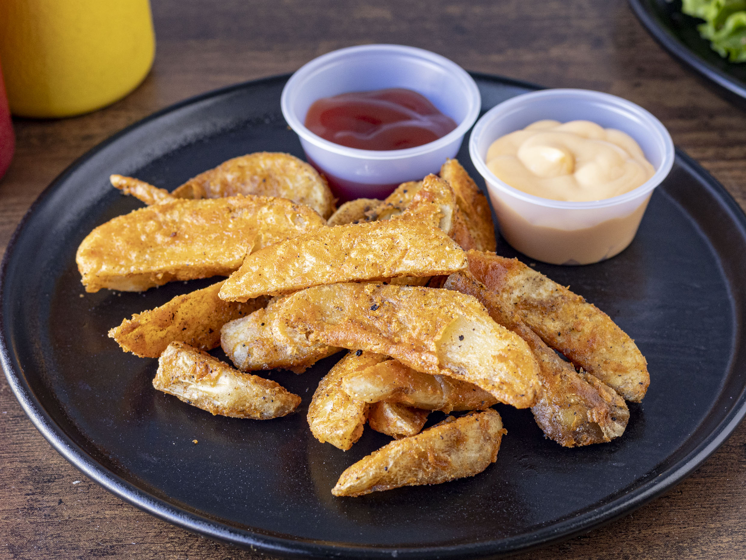 Queso, piña, chorizo y tocino con una porción de papas.