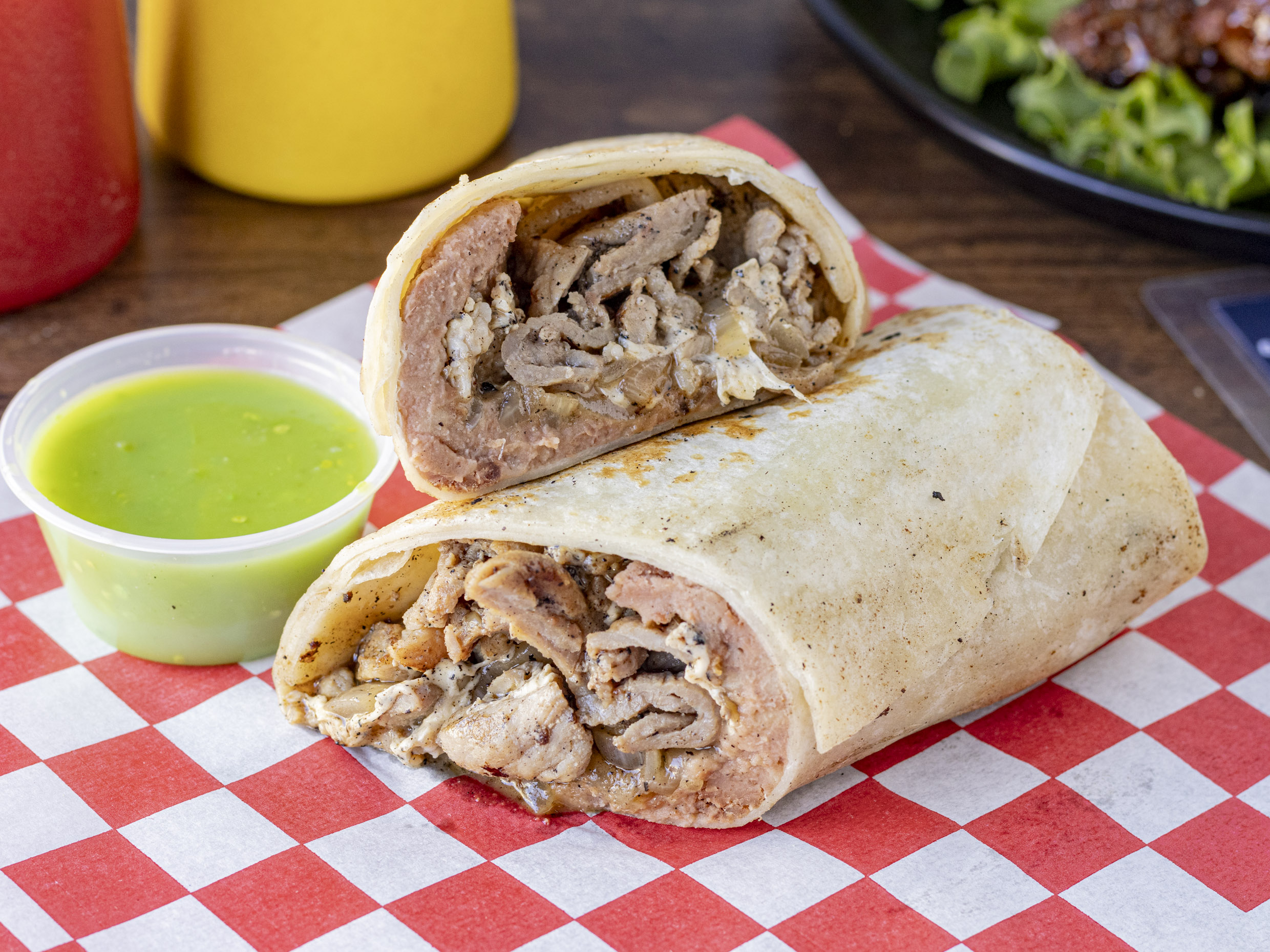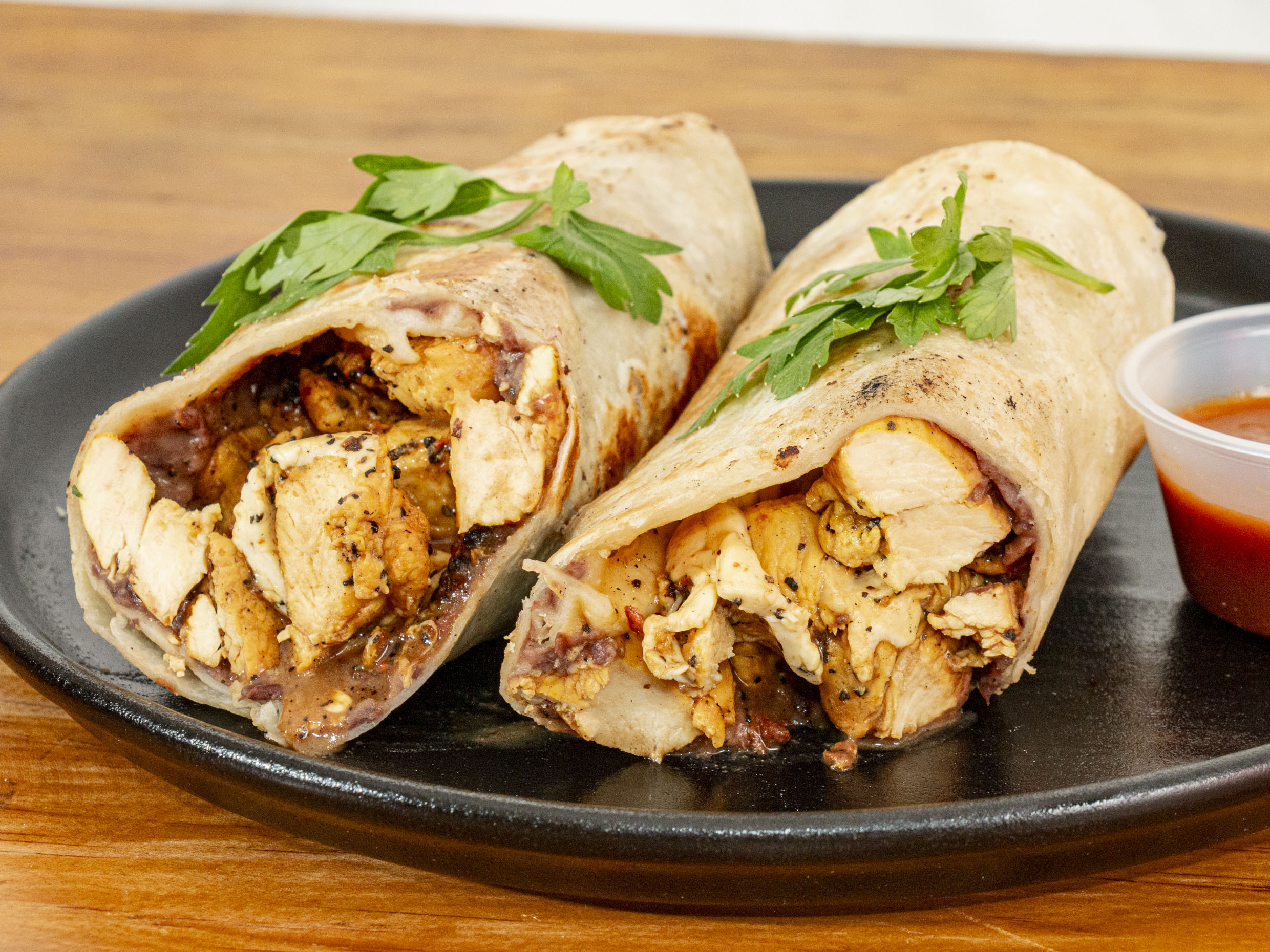 Burrito de 30 cm. Relleno de frijoles fajitas de pollo y queso Oaxaca.